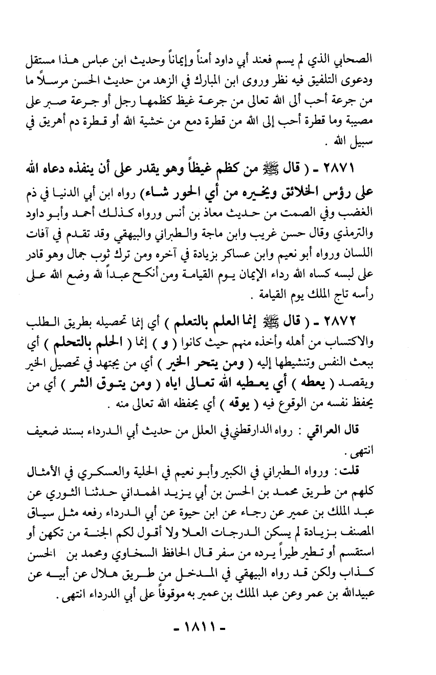 2871 - (قال - صلّى الله عليه وسلم - من كظم غيظاً وهو يقدر على أن ينفذه دعاه الله على رؤس الخلائق ويخيره من أي الحور شاء) رواه ابن أبي الدنيا في ذم الغضب وفي الصمت من حديث معاذ بن أنس ورواه كذلك أحمد وأبو داود والترمذي وقال حسن غريب وابن ماجة والطبراني والبيهقي وقد تقدم في آفات اللسان ورواه أبو نعيم وابن عساكر بزيادة في آخره ومن ترك ثوب جمال وهو قادر على لبسه كساه الله رداء الإيمان يوم القيامة ومن أنكح عبداً لله وضع الله على رأسه تاج الملك يوم القيامة.