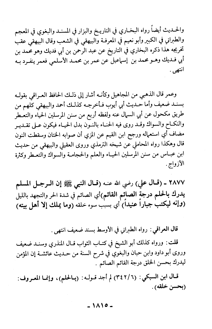 والحديث أيضاً رواه البخاري في التاريخ والبزار في المسند والبغوي في المعجم والطبراني في الكبير وأبو نعيم في المعرفة والبيهقي في الشعب وقال البيهقي عقب تخريجه هذا ذكره البخاري في التاريخ عن عبد الرحمن بن أبي فديك وهو محمد بن أبي فديك وهو محمد بن إسماعيل عن عمر بن محمد الأسلمي فعمر ينفرد به انتهى.