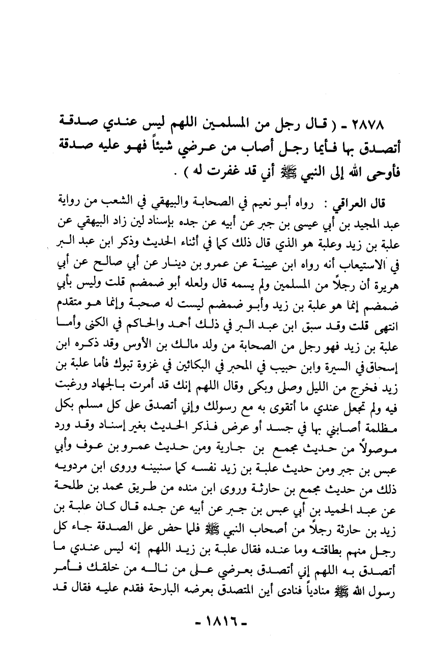 قال العراقي: رواه أبو نعيم في الصحابة والبيهقي في الشعب من رواية عبد المجيد بن أبي عيسى بن جبر عن أبيه عن جده بإسناد لين زاد البيهقي عن علبة بن زيد وعلبة هو الذي قال ذلك كما في أثناء الحديث وذكر ابن عبد البر في الاستيعاب أنه رواه ابن عيينة عن عمرو بن دينار عن أبي صالح عن أبي هريرة أن رجلاً من المسلمين ولم يسمه قال ولعله أبو ضمضم قلت وليس بأي ضمضم إنما هو علبة بن زيد وأبو ضمضم ليست له صحبة وإنما هو متقدم انتهى قلت وقد سبق ابن عبد البر في ذلك أحمد والحاكم في الكنى وأما علبة بن زيد فهو رجل من الصحابة من ولده مالك بن الأوس وقد ذكره ابن إسحاق في السيرة وابن حبيب في المحبر في البكائين في غزوة تبوك فأما علبة بن زيد فخرج من الليل وصلى وبكى وقال اللهم إنك قد أمرت بالجهاد ورغبت فيه ولم تجعل عندي ما أتقوى به مع رسولك وإني أتصدق على كل مسلم بكل مظلمة أصابني بها في جسد أو عرض فذكر الحديث بغير إسناد وقد ورد موصولاً من حديث مجمع بن جارية ومن حديث عمرو بن عوف وأبي عبس بن جبر ومن حديث علبة بن زيد نفسه كما سنبينه وروى ابن مردويه ذلك من حديث مجمع بن حارثة وروى ابن منده من طريق محمد بن طلحة عن عبد الحميد بن أبي عبس بن جبر عن أبيه عن جده قال كان علبة بن زيد بن حارثة رجلاً من أصحاب النبي - صلّى الله عليه وسلم - فلما حض على الصدقة جاء كل رجل منهم بطاقته وما عنده فقال علبة بن زيد اللهم إنه ليس عندي ما أتصدق به اللهم إني أتصدق بعرضي على من ناله من خلقك فأمر رسول الله - صلّى الله عليه وسلم - منادياً فنادى أين المتصدق بعرضه البارحة فقدم عليه فقال قد