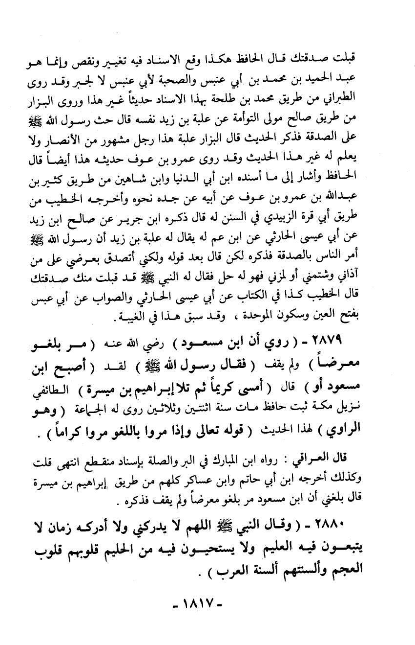 قال العراقي: رواه ابن المبارك في البر والصلة بإسناد منقطع انتهى قلت وكذلك أخرجه ابن أبي حاتم وابن عساكر كلهم من طريق إبراهيم بن ميسرة قال بلغني أن ابن مسعود مر بلغو معرضاً ولم يقف فذكره.