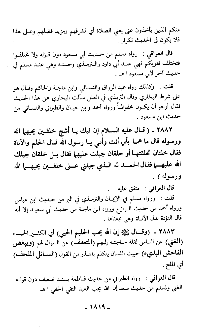 2882 - (قال عليه السلام إن فيك يا أشج خلقين يحبهما الله ورسوله قال ما هما بأبي أنت وأمي يا رسول الله قال الحلم والأناة فقال خلتان تخلقتها أو خلقان جبلت عليهما فقال بل خلقان جبلك الله عليهما فقال الحمد لله الذي جبلني على خلقين يحبهما الله ورسوله).