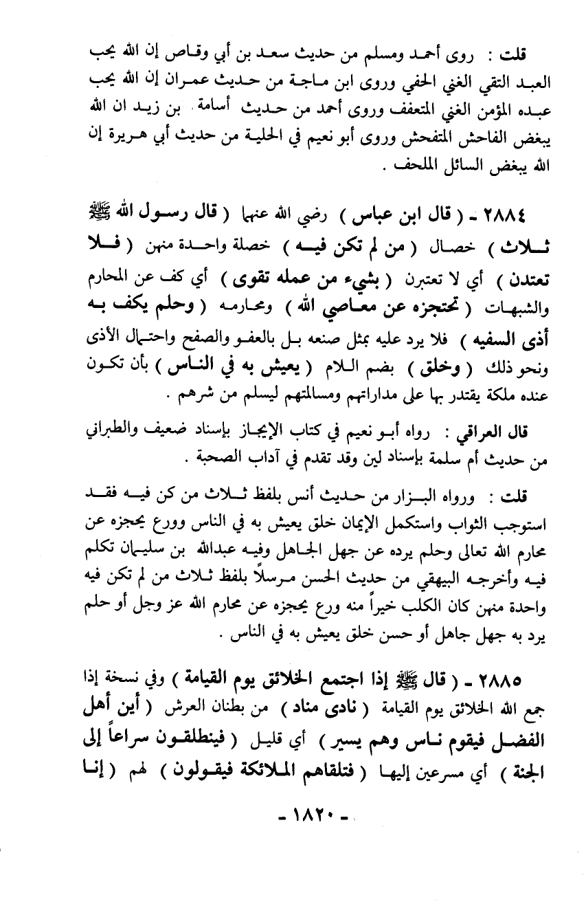 2884 - (قال ابن عباس) رضي الله عنهما (قال رسول الله - صلّى الله عليه وسلم - ثلاث) خصال (من لم تكن فيه) خصلة واحدة منهن (فلا تعتدن) أي لا تعتبرن (بشيء من عمله تقوى) أي كف عن المحارم والشبهات (تحتجزه عن معاصي الله) ومحارمه (وحلم يكف به أذى السفيه) فلا يرد عليه بمثل صنعه بل بالعفو والصفح واحتمال الأذى ونحو ذلك (وخلق) بضم اللام (يعيش به في الناس) بأن تكون عنده ملكة يقتدر بها على مداراتهم ومسالمتهم ليسلم من شرهم.