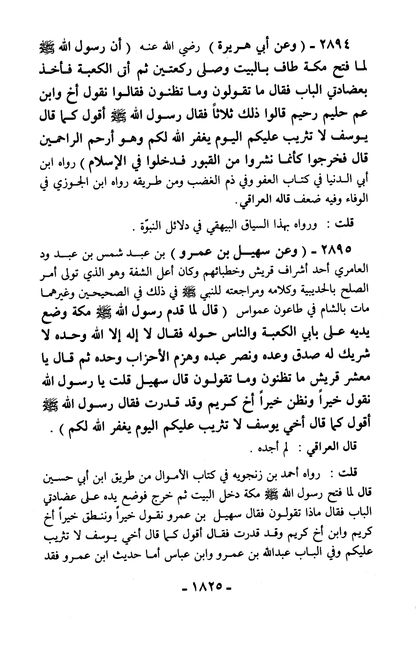 2894 - (وعن أبي هريرة) رضي الله عنه (أن رسول الله - صلّى الله عليه وسلم - لما فتح مكة طاف بالبيت وصلى ركعتين ثم أتى الكعبة فأخذ بعضادتي الباب فقال ما تقولون وما تظنون فقالوا نقول أخ وابن عم حليم رحيم قالوا ذلك ثلاثاً فقال رسول الله - صلّى الله عليه وسلم - أقول كما قال يوسف لا تثريب عليكم اليوم يغفر الله لكم وهو أرحم الراحمين قال فخرجوا كأنما نشروا من القبور فدخلوا في الإسلام) رواه ابن أبي الدنيا في كتاب العفو وفي ذم الغضب ومن طريقه رواه ابن الجوزي في الوفاء وفيه ضعف قاله العراقي.