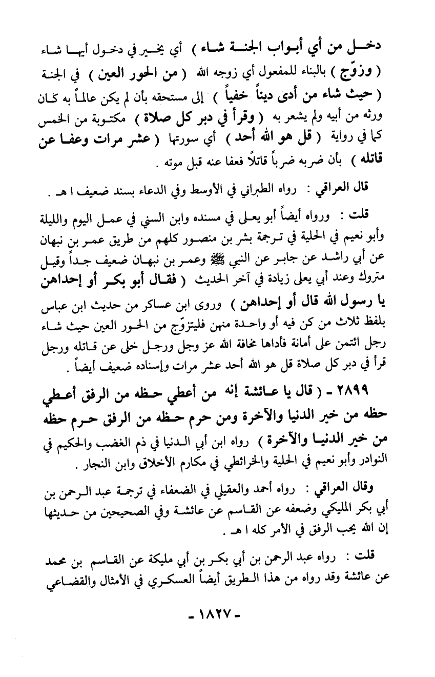 2899 - (قال يا عائشة إنه من أعطي حظه من الرفق أعطي حظه من خير الدنيا والآخرة ومن حرم حظه من الرفق حرم حظه من خير الدنيا والآخرة) رواه ابن أبي الدنيا في ذم الغضب والحكيم في النوادر وأبو نعيم في الحلية والخرائطي في مكارم الأخلاق وابن النجار.