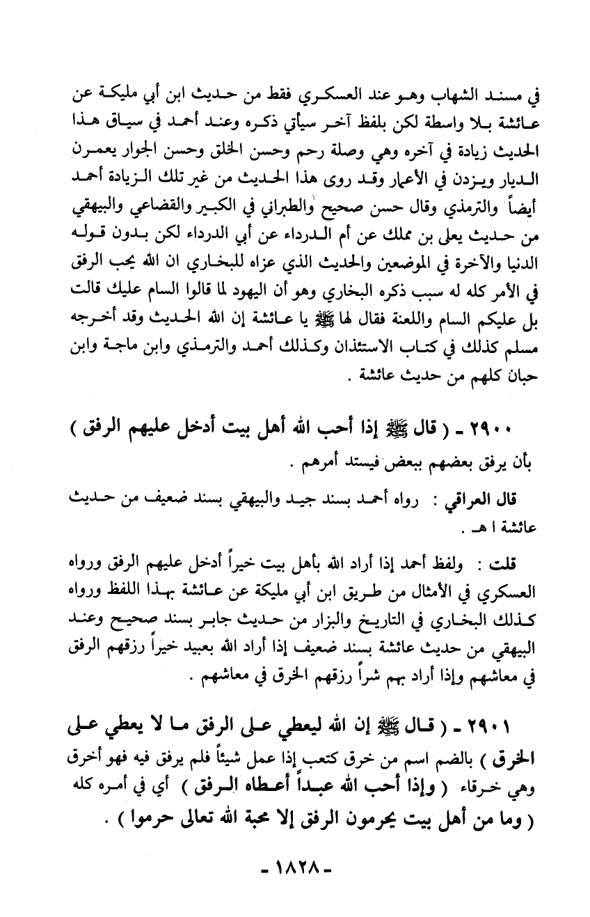 قلت: ولفظ أحمد إذا أراد الله بأهل بيت خيراً أدخل عليهم الرفق ورواه العسكري في الأمثال من طريق ابن أبي مليكة عن عائشة بهذا اللفظ ورواه كذلك البخاري في التاريخ والبزار من حديث جابر بسند صحيح وعند البيهقي من حديث عائشة بسند ضعيف إذا أراد الله بعبيد خيراً رزقهم الرفق في معاشهم وإذا أراد بهم شراً رزقهم الخرق في معاشهم.