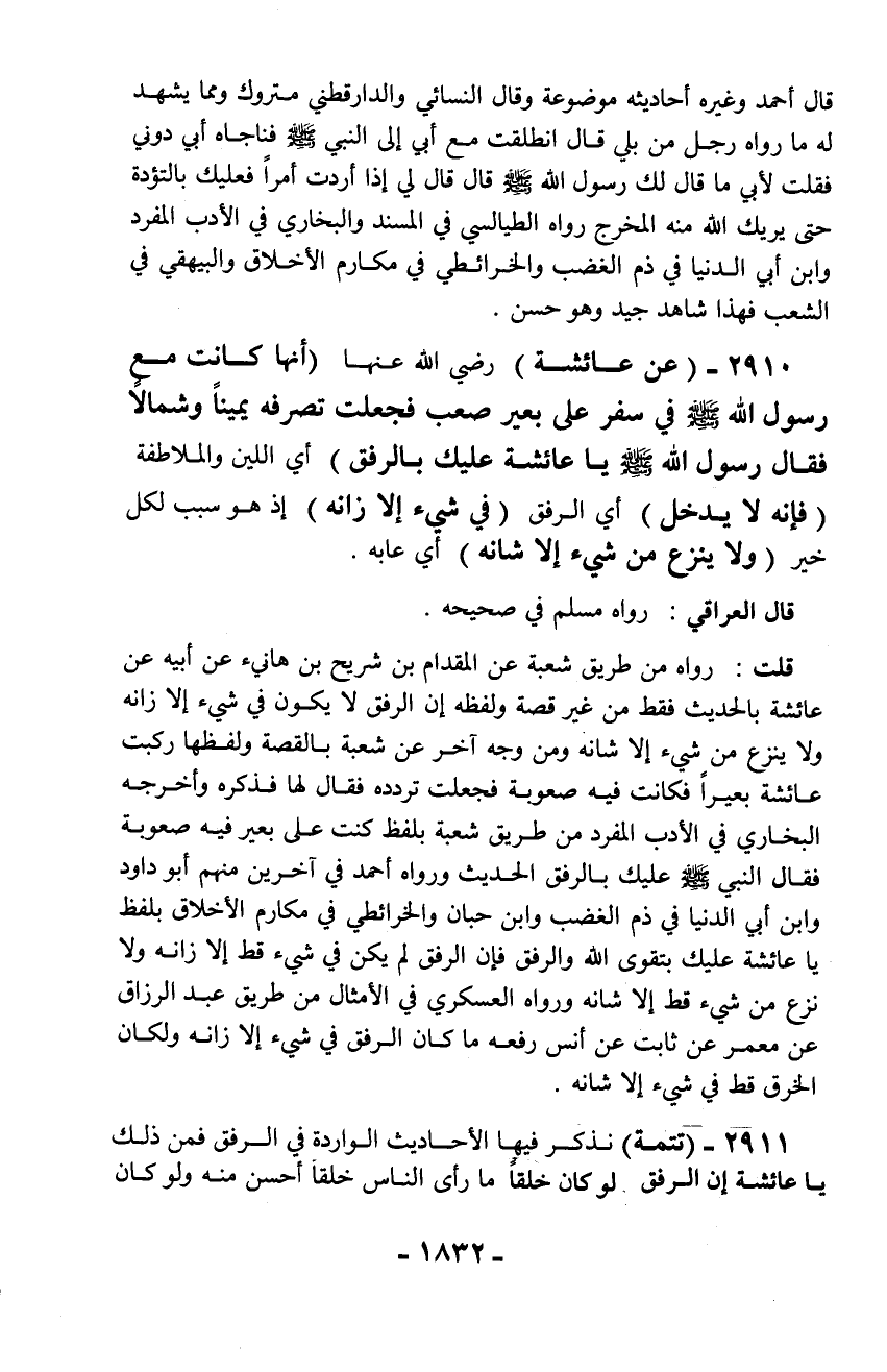 2911 - (تتمة) نذكر فيها الأحاديث الواردة في الرفق فمن ذلك يا عائشة إن الرفق لو كان خلقاً مما رأى الناس خلقا أحسن منه ولو كان