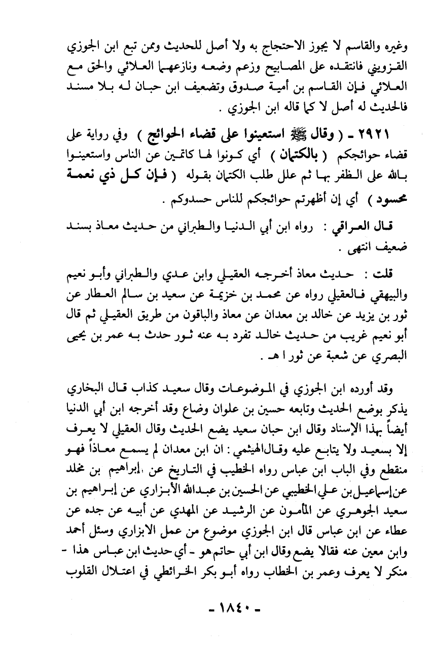 2921 - (وقال - صلّى الله عليه وسلم - استعينوا على قضاء الحوائج) وفي رواية على قضاء حوائجكم (بالكتمان) أي كونوا لها كاتمين عن الناس واستعينوا بالله على الظفر بها ثم علل طلب الكتمان بقوله (فإن كل ذي نعمة محسود) أي إن أظهرتم حوائجكم للناس حسدوكم.