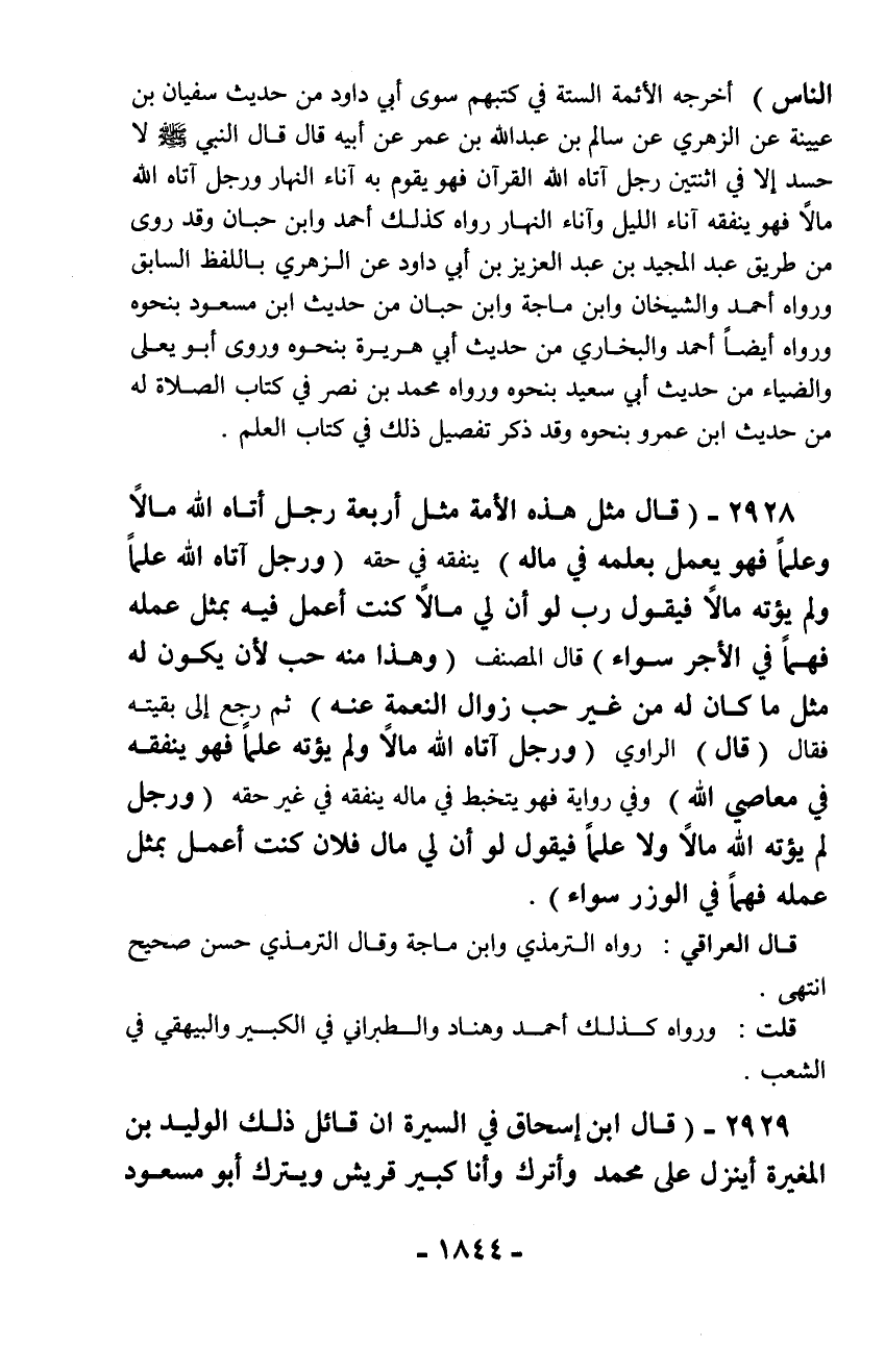 الناس) أخرجه الأئمة الستة في كتبهم سوى أبي داود من حديث سفيان بن عيينة عن الزهري عن سالم بن عبد الله بن عمر عن أبيه قال قال النبي - صلّى الله عليه وسلم - لا حسد إلا في اثنتين رجل آتاه الله القرآن فهو يقوم به آناء النهار ورجل آتاه الله مالاً فهو ينفقه آناء الليل وآناء النهار رواه كذلك أحمد وابن حبان وقد روى من طريق عبد المجيد بن عبد العزيز بن أبي داود عن الزهري باللفظ السابق ورواه أحمد والشيخان وابن ماجة وابن حبان من حديث ابن مسعود بنحوه ورواه أيضاً أحمد والبخاري من حديث أبي هريرة بنحوه وروى أبو يعلى والضياء من حديث أبي سعيد بنحوه ورواه محمد بن نصر في كتاب الصلاة له من حديث ابن عمرو بنحوه وقد ذكر تفصيل ذلك في كتاب العلم.