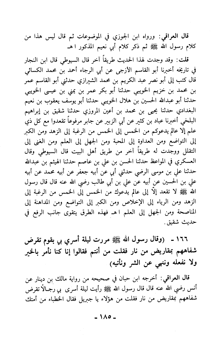 166 - (وقال رسول الله - صلى الله عليه وسلم - مررت ليلة أسري بي بقوم تقرض شفاههم بمقاريض من نار فقلت من أنتم فقالوا إنا كنا نأمر بالخير ولا نفعله وننهي عن الشر ونأتيه)
