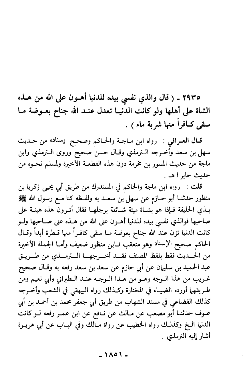 2935 - (قال والذي نفسي بيده للدنيا أهون على الله من هذه الشاة على أهلها ولو كانت الدنيا تعدل عند الله جناح بعوضة ما سقى كافراً منها شربة ماء).