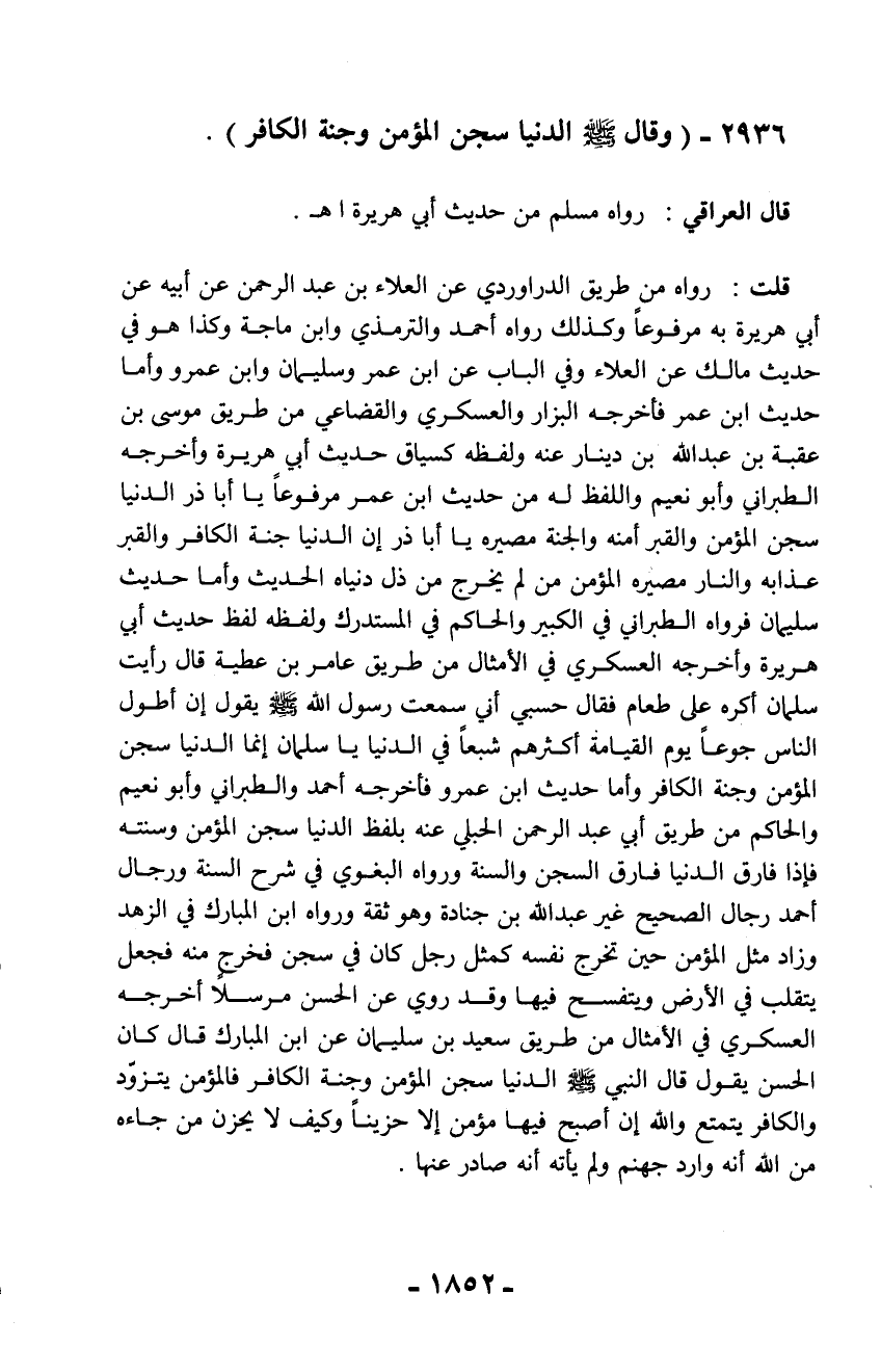 2936 - (وقال - صلّى الله عليه وسلم - الدنيا سجن المؤمن وجنة الكافر).