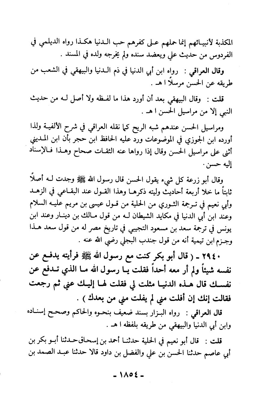 وقال العراقي: رواه ابن أبي الدنيا في ذم الدنيا والبيهقي في الشعب من طريقه عن الحسن مرسلاً اهـ.