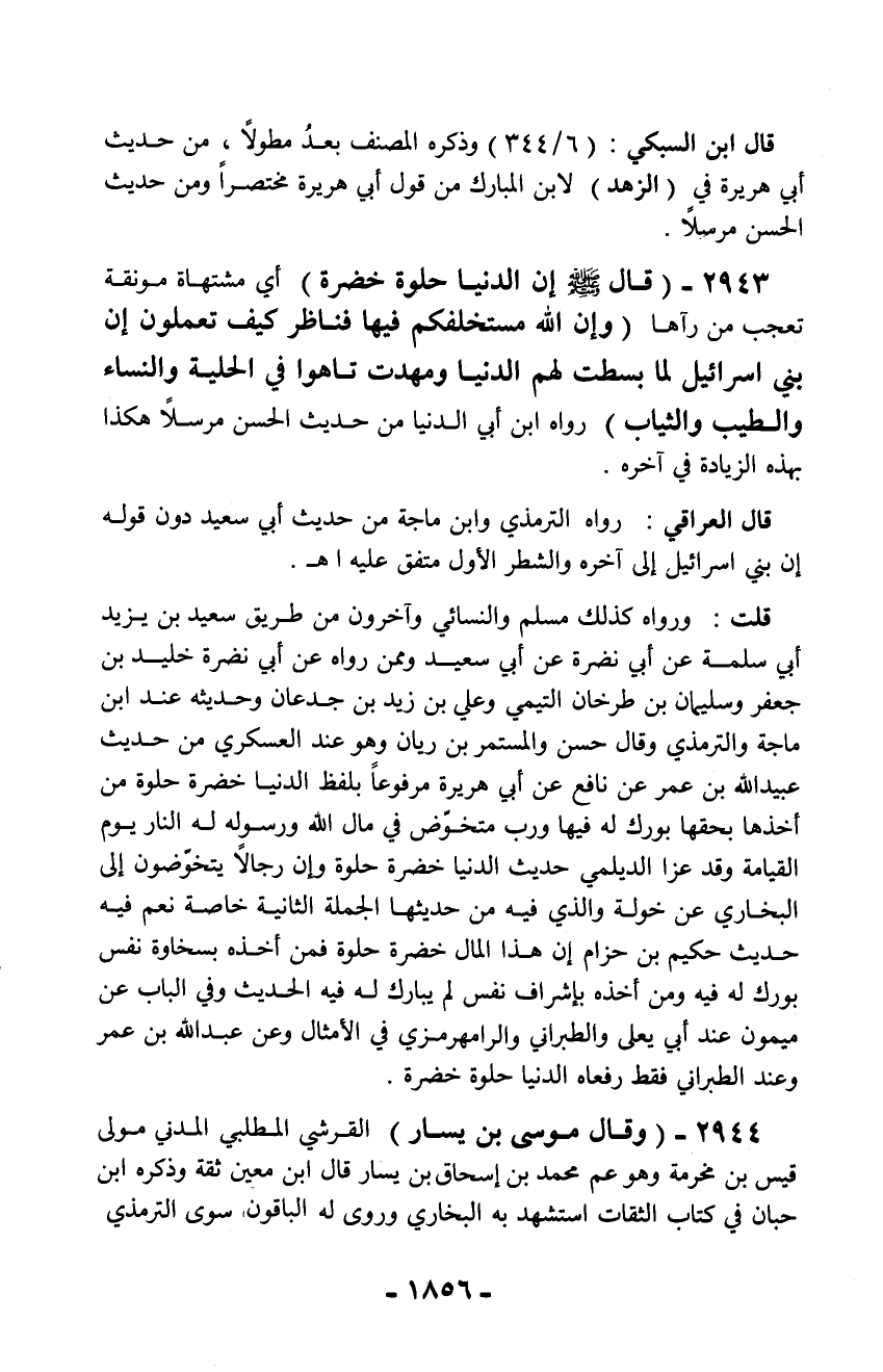 قلت: ورواه كذلك مسلم والنسائي وآخرون من طريق سعيد بن يزيد أبي سلمة عن أبي نضرة عن أبي سعيد وممن رواه عن أبي نضرة خليد بن جعفر وسليمان بن طرخان التيمي وعلي بن زيد بن جدعان وحديثه عند ابن ماجة والترمذي وقال حسن والمستمر بن ريان وهو عند العسكري من حديث عبيد الله بن عمر عن نافع عن أبي هريرة مرفوعاً بلفظ الدنيا خضرة حلوة من أخذها بحقها بورك له فيها ورب متخوَض في مال الله ورسوله له النار يوم القيامة وقد عزا الديلمي حديث الدنيا خضرة حلوة وإن رجالاً يتخوّضون إلى البخاري عن خولة والذي فيه من حديثها الجملة الثانية خاصة نعم فيه حديث حكيم بن حزام إن هذا المال خضرة حلوة فمن أخذه بسخاوة نفس بورك له فيه ومن أخذه بإشراف نفس لم يبارك له فيه الحديث وفي الباب عن ميمون عند أبي يعلى والطبراني والرامهرمزي في الأمثال وعن عبد الله بن عمر وعند الطبراني فقط رفعاه الدنيا حلوة خضرة.