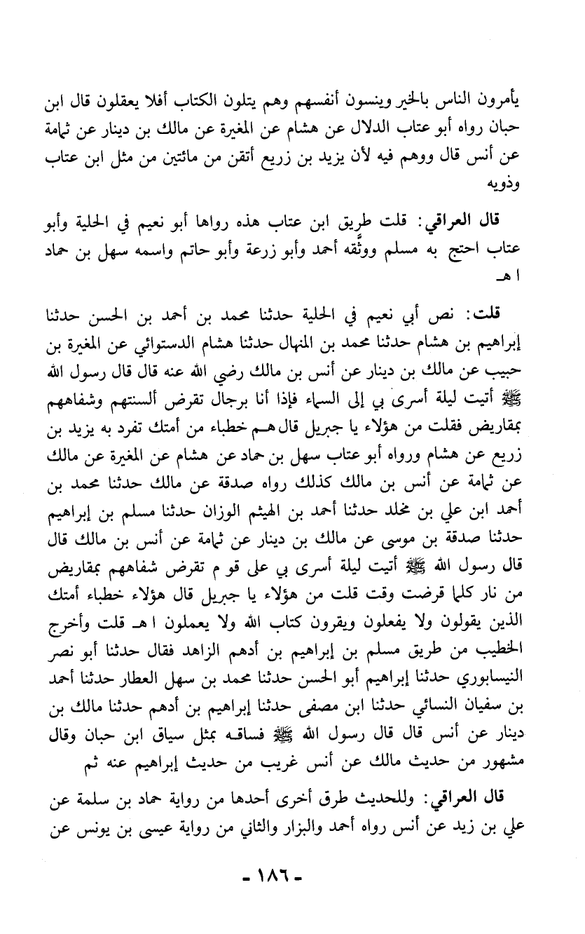 قلت: نص أبي نعيم في الحلية حدثنا محمد بن أحمد بن الحسن حدثنا إبراهيم بن هشام حدثنا محمد بن المنهال حدثنا هشام الدستوائي عن المغيرة بن حبيب عن مالك بن دينار عن أنس بن مالك رضي الله عنه قال قال رسول الله - صلى الله عليه وسلم - أتيت ليلة أسرى بي إلى السماء فإذا أنا برجال تقرض ألسنتهم وشفاههم بمقاريض فقلت من هؤلاء يا جبريل قال هم خطباء من أمتك تفرد به يزيد بن زريع عن هشام ورواه أبو عتاب سهل بن حماد عن هشام عن المغيرة عن مالك عن ثمامة عن أنس بن مالك كذلك رواه صدقة عن مالك حدثنا محمد بن أحمد ابن علي بن مخلد حدثنا أحمد بن الهيثم الوزان حدثنا مسلم بن إبراهيم حدثنا صدقة بن موسى عن مالك بن دينار عن ثمامة عن أنس بن مالك قال قال رسول الله - صلى الله عليه وسلم - أتيت ليلة أسرى بي على قوم تقرض شفاههم بمقاريض من ناركلما قرضت وقت قلت من هؤلاء يا جبريل قال هؤلاء خطباء أمتك الذين يقولون ولا يفعلون ويقرون كتاب الله ولا يعملون اهـ قلت وأخرج الخطيب من طريق مسلم بن إبراهيم بن أدهم الزاهد فقال حدثنا أبو نصر النيسابوري حدثنا إبراهيم أبو الحسن حدثنا محمد بن سهل العطار حدثنا أحمد بن سفيان النسائي حدثنا ابن مصفى حدثنا إبراهيم بن أدهم حدثنا مالك بن دينار عن أنس قال قال رسول الله - صلى الله عليه وسلم - فساقه بمثل سياق ابن حبان وقال مشهور من حديث مالك عن أنس غريب من حديث إبراهيم عنه ثم