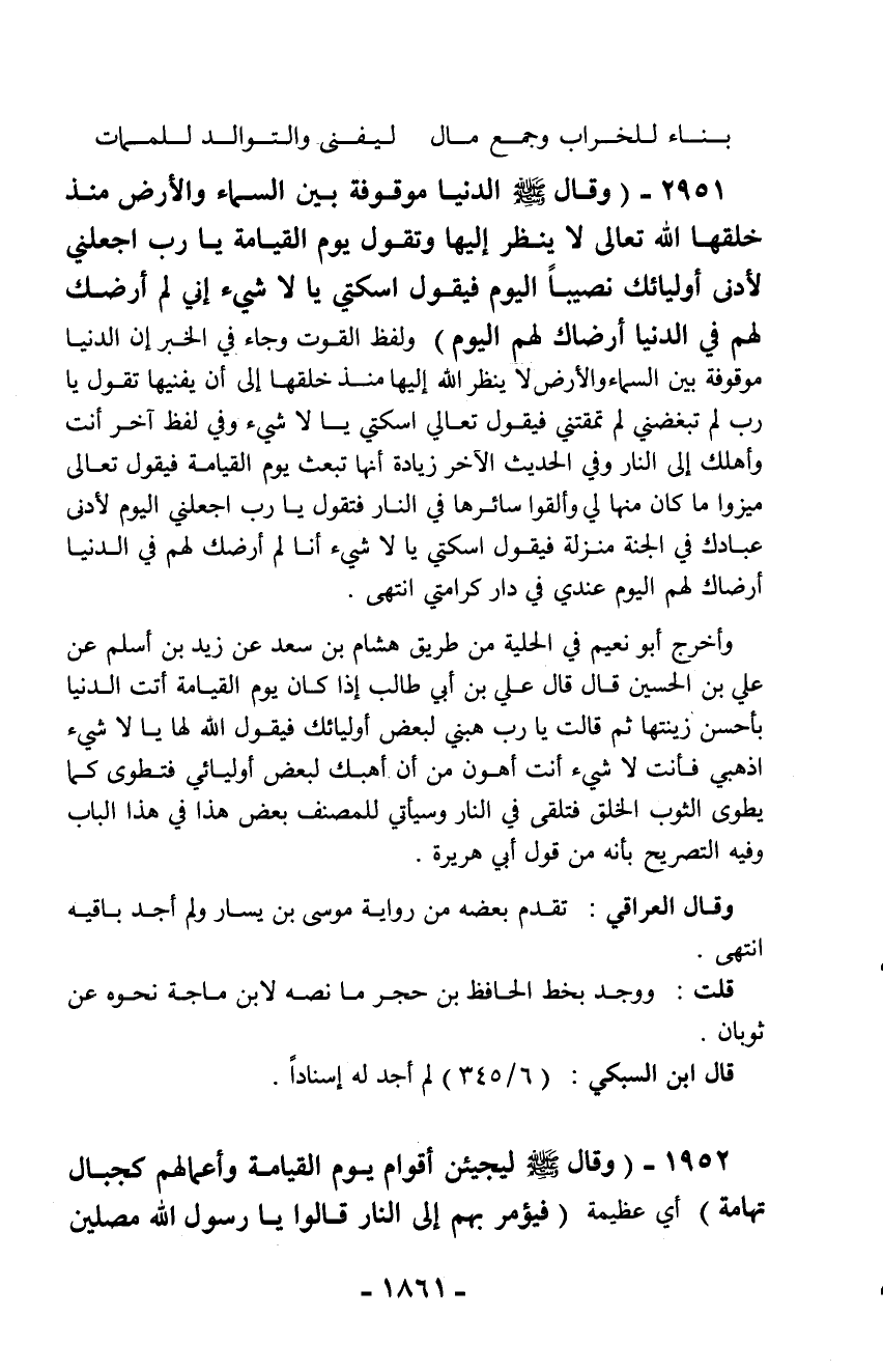 2951 - (وقال - صلّى الله عليه وسلم - الدنيا موقوفة بين السماء والأرض منذ خلقها الله تعالى لا ينظر إليها وتقول يوم القيامة يا رب اجعلني لأدني أوليائك نصيباً اليوم فيقول اسكتي يا لا شيء إني لم أرضك لهم في الدنيا أرضاك لهم اليوم) ولفظ القوت وجاء في الخبر إن الدنيا موقوفة بين السماء والأرض لا ينظر الله إليها منذ خلقها إلى أن يفنيها تقول يا رب لم تبغضني لم تمقتني فيقول تعالي اسكتي يا لا شيء وفي لفظ آخر أنت وأهلك إلى النار وفي الحديث الآخر زيادة أنها تبعث يوم القيامة فيقول تعالى ميزوا ما كان منها لي وألقوا سائرها في النار فتقول يا رب اجعلني اليوم لأدنى عبادك في الجنة منزلة فيقول اسكتي يا لا شيء أنا لم أرضك لهم في الدنيا أرضاك لهم اليوم عندي في دار كرامتي انتهى.