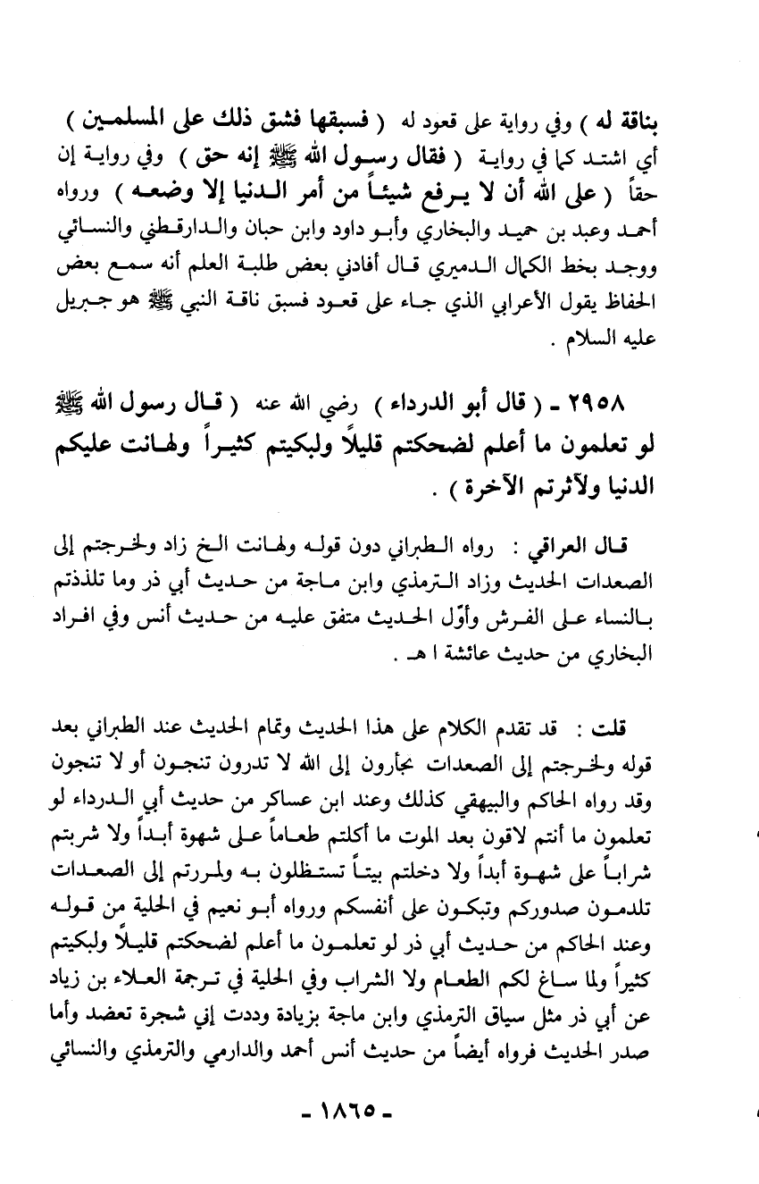 2958 - (قال أبو الدرداء) رضي الله عنه (قال رسول الله - صلّى الله عليه وسلم - لو تعلمون ما أعلم لضحكتم قليلاً ولبكيتم كثيراً ولهانت عليكم الدنيا ولآثرتم الآخرة).