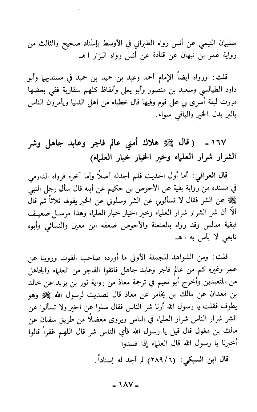 167 - (قال - صلى الله عليه وسلم - هلاك أمتي عالم فاجر وعابد جاهل وشر الشرار شرار العلماء وخير الخيار خيار العلماء)