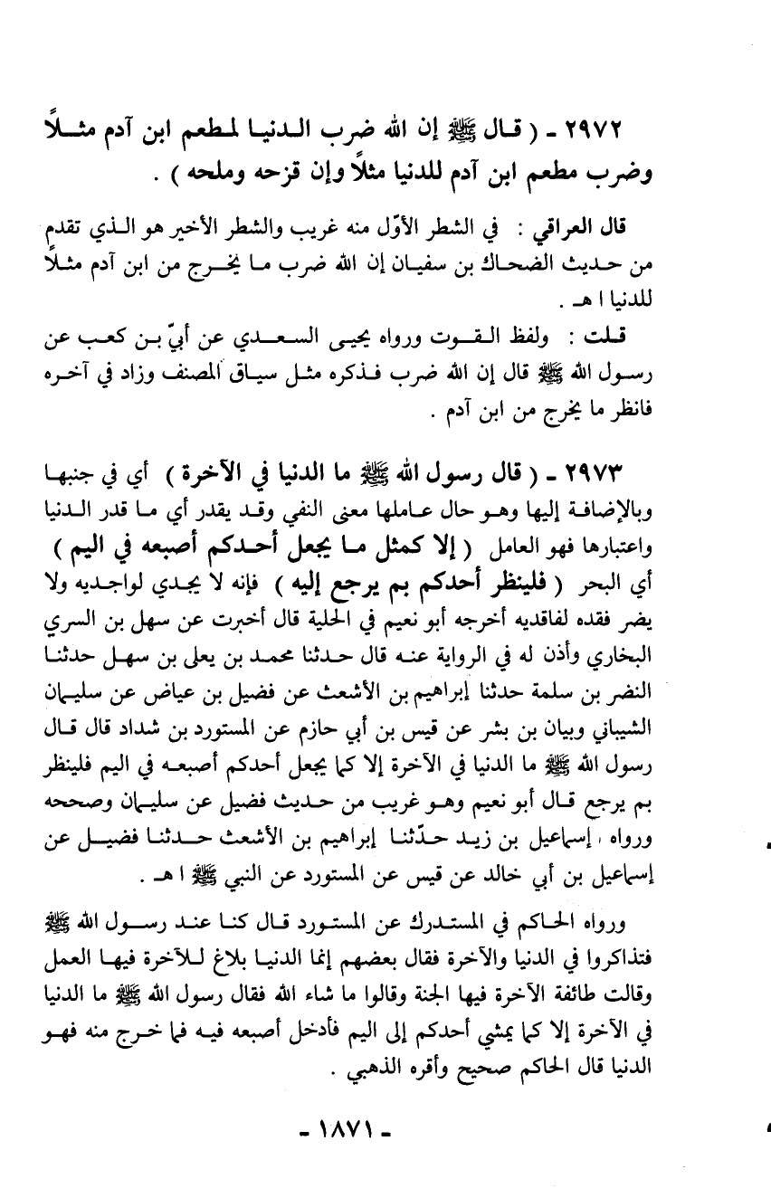 ورواه الحاكم في المستدرك عن المستورد قال كنا عند رسول الله - صلّى الله عليه وسلم - فتذاكروا في الدنيا والآخرة فقال بعضهم إنما الدنيا بلاغ للآخرة فيها العمل وقالت طائفة الآخرة فيها الجنة وقالوا ما شاء الله فقال رسول الله - صلّى الله عليه وسلم - ما الدنيا في الآخرة إلا كما يمشي أحدكم إلى اليم فأدخل أصبعه فيه فما خرج منه فهو الدنيا قال الحاكم صحيح وأقره الذهبي.