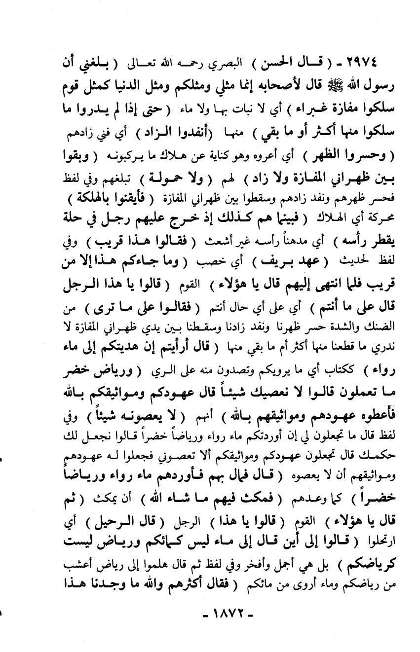 2974 - (قال الحسن) البصري رحمه الله تعالى (بلغني أن رسول الله - صلّى الله عليه وسلم - قال لأصحابه إنما مثلي ومثلكم ومثل الدنيا كمثل قوم سلكوا مفازة غبراء) أي لا نبات بها ولا ماء (حتى إذا لم يدروا ما سلكوا منها أكثر أو ما بقي) منها (أنفدوا الزاد) أي فني زادهم (وحسروا الظهر) أي أعروه وهو كناية عن هلاك ما يركبونه (وبقوا بين ظهراني المفازة ولا زاد) لهم (ولا حمولة) تبلغهم وفي لفظ فحسر ظهرهم ونفد زادهم وسقطوا بين ظهراني المفازة (فأيقنوا بالهلكة) محركة أي الهلاك (فبينما هم كذلك إذ خرج عليهم رجل في حلة يقطر رأسه) أي مدهناً رأسه غير أشعث (فقالوا هذا قريب) وفي لفظ لحديث (عهد بريف) أي خصب (وما جاءكم هذا إلا من قريب فلما انتهى إليهم قال يا هؤلاء) القوم (قالوا يا هذا الرجل قال على ما أنتم) أي على أي حال أنتم (فقالوا على ما ترى) من الضنك والشدة حسر ظهرنا ونفد زادنا وسقطنا بين يدي ظهراني المفازة لا ندري ما قطعنا منها أكثر أم ما بقي منها (قال أرأيتم إن هديتكم إلى ماء رواء) ككتاب أي ما يرويكم وتصدون منه على الري (ورياض خضر ما تعملون قالوا لا نعصيك شيئاً قال عهودكم ومواثيقكم بالله فأعطوه عهودهم ومواثيقهم بالله) أنهم (لا يعصونه شيئاً) وفي لفظ قال ما تجعلون لي إن أوردتكم ماء رواء ورياضاً خضراً قالوا نجعل لك حكمك قال تجعلون عهودكم ومواثيقكم ألا تعصوني فجعلوا له عهودهم ومواثيقهم أن لا يعصوه (قال فمال بهم فأوردهم ماء رواء ورياضاً خضراً) كما وعدهم (فمكث فيهم ما شاء الله) أن يمكث (ثم قال يا هؤلاء) القوم (قالوا يا هذا) الرجل (قال الرحيل) أي ارتحلوا (قالوا إلى أين قال إلى ماء ليس كمائكم ورياض ليست كرياضكم) بل هي أجمل وأفخر وفي لفظ ثم قال هلموا إلى رياض أعشب من رياضكم وماء أروى من مائكم (فقال أكثرهم والله ما وجدنا هذا