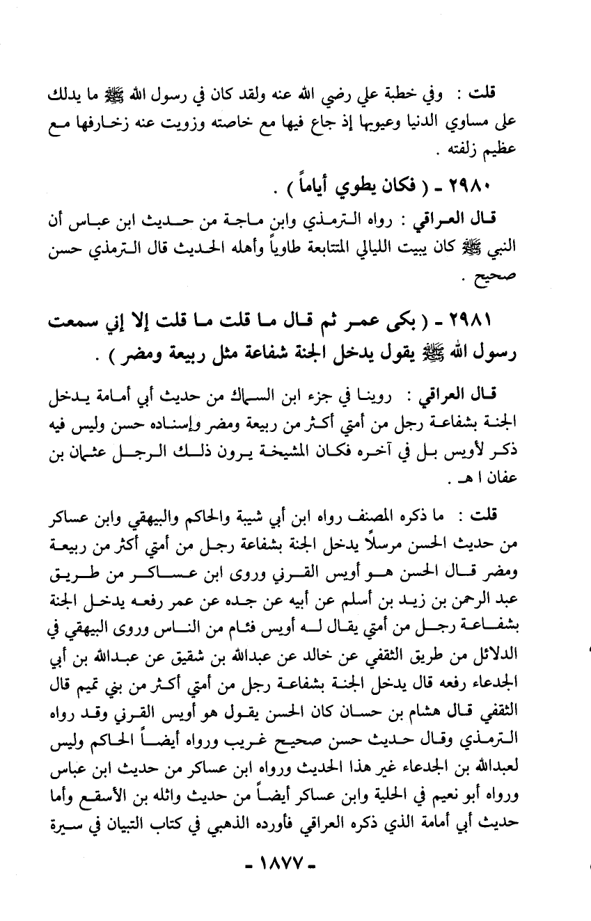 قال العراقي: روينا في جزء ابن السماك من حديث أبي أمامة يدخل الجنة بشفاعة رجل من أمتي أكثر من ربيعة ومضر وإسناده حسن وليس فيه ذكر لأويس بل في آخره فكان المشيخة يرون ذلك الرجل عثمان بن عفان اهـ.
