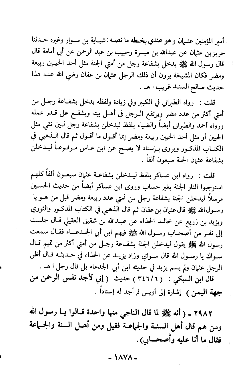 أمير المؤمنين عثمان وهو عندي بخطه ما نصه: شبابة بن سوار وغيره حدثنا حريز بن عثمان عن عبد الله بن ميسرة وحبيب بن عبد الرحمن عن أبي أمامة قال قال رسول الله - صلّى الله عليه وسلم - يدخل بشفاعة رجل من أمتي الجنة مثل أحد الحيين ربيعة ومضر فكان المشيخة يرون أن ذلك الرجل عثمان بن عفان رضي الله عنه هذا حديث صالح السند غريب اهـ.