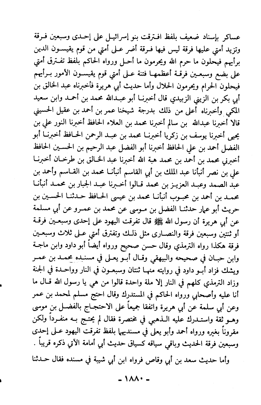 عساكر بإسناد ضعيف بلفظ افترقت بنو إسرئيل على إحدى وسبعين فرقة وتزيد أمتي عليها فرقة ليس فيها فرقة أضر على أمتي من قوم يقيسون الدين برأيهم فيحلون ما حرم الله ويحرمون ما أحل ورواه الحاكم بلفظ تفترق أمتي على بضع وسبعين فرقة أعظمها فتنة على أمتي قوم يقيسون الأمور برأيهم فيحلون الحرام ويحرمون الحلال وأما حديث أبي هريرة فأخبرناه عبد الخالق بن أبي بكر بن الزيني الزبيدي قال أخبرنا أبو عبد الله محمد بن أحمد وابن سعيد المكي وأخبرناه أعلى من ذلك بدرجة شيخنا عمر بن أحمد بن عقيل الحسيني قالا أخبرنا عبد الله بن سالم أخبرنا محمد بن العلاء الحافظ أخبرنا النور علي بن يحيى أخبرنا يوسف بن زكريا أخبرنا محمد بن عبد الرحمن الحافظ أخبرنا أبو الفضل أحمد بن علي الحافظ أخبرنا أبو الفضل عبد الرحيم بن الحسين الحافظ أخبرني محمد بن أحمد بن محمد هبة الله أخبرنا عبد الخالق بن طرخان أخبرنا علي بن نصر أنبأنا عبد الملك بن أبي القاسم أنبأنا محمد بن القاسم وأحمد بن عبد الصمد وعبد العزيز بن محمد قالوا أخبرنا عبد الجبار بن محمد أنبأنا محمد بن أحمد بن محبوب أنبأنا محمد بن عيسى الحافظ حدثنا الحسين بن حريث أبو عمار حدثنا الفضل بن موسى عن محمد بن عمرو عن أبي مسلمة عن أبي هريرة أن رسول الله - صلّى الله عليه وسلم - قال تفرقت اليهود على إحدى وسبعين فرقة أو ثنتين وسبعين فرقة والنصارى مثل ذلك وتفترق أمتي على ثلاث وسبعين فرقة هكذا رواه الترمذي وقال حسن صحيح ورواه أيضاً أبو داود وابن ماجة وابن حبان في صحيحه والبيهقي وقال أبو يعلى في مسنده محمد بن عمر ويشك فزاد أبو داود في روايته منها ثنتان وسبعون في النار وواحدة في الجنة وزاد الترمذي كلهم في النار إلا ملة واحدة قالوا من هي يا رسول الله قال ما أنا عليه وأصحابي ورواه الحاكم في المستدرك وقال احتج مسلم لمحمد بن عمر وعن أبي سلمة عن أبي هريرة واتفقا جميعاً على الاحتجاج بالفضل بن موسى وهو ثقة واستدرك عليه الذهبي في مختصرة فقال لم يحتج به منفرداً ولكن مقروناً بغيره ورواه أحمد وأبو يعلى في مسنديهما بلفظ تفرقت اليهود على إحدى وسبعين فرقة الحديث وباقي سياقه كسياق حديث أبي أمامة الآتي ذكره قريباً.