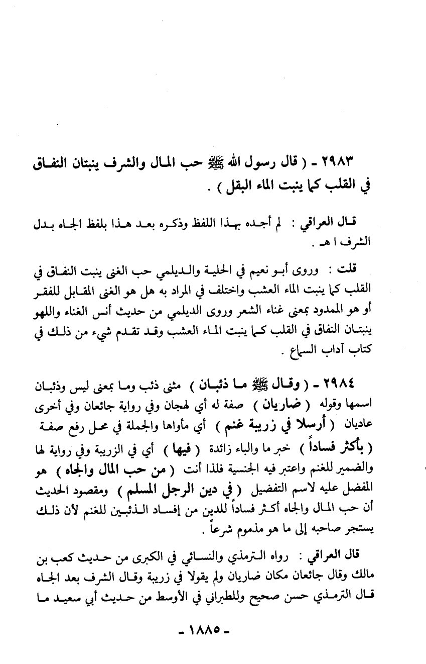 2983 - (قال رسول الله - صلّى الله عليه وسلم - حب المال والشرف ينبتان النفاق في القلب كما ينبت الماء البقل).
