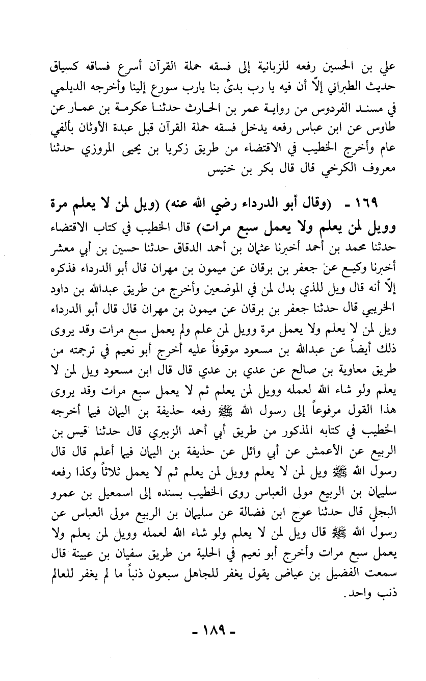 169 - (وقال أبو الدرداء رضي الله عنه) (ويل لمن لا يعلم مرة وويل لمن يعلم ولا يعمل سبع مرات) قال الخطيب في كتاب الاقتضاء حدثنا محمد بن أحمد أخبرنا عثمان بن أحمد الدقاق حدثنا حسين بن أبي معشر أخبرنا وكيع عن جعفر بن برقان عن ميمون بن مهران قال أبو الدرداء فذكره إلاّ أنه قال ويل للذي بدل لمن في الموضعين وأخرج من طريق عبد الله بن داود الخريبي قال حدثنا جعفر بن برقان عن ميمون بن مهران قال قال أبو الدرداء ويل لمن لا يعلم ولا يعمل مرة وويل لمن علم ولم يعمل سبع مرات وقد يروى ذلك أيضاً عن عبد الله بن مسعود موقوفاً عليه أخرج أبو نعيم في ترجمته من طريق معاوية بن صالح عن عدي بن عدي قال قال ابن مسعود ويل لمن لا يعلم ولو شاء الله لعمله وويل لمن يعلم ثم لا يعمل سبع مرات وقد يروى هذا القول مرفوعاً إلى رسول الله - صلى الله عليه وسلم - رفعه حذيفة بن اليمان فيما أخرجه الخطيب في كتابه المذكور من طريق أبي أحمد الزبيري قال حدثنا قيس بن الربيع عن الأعمش عن أبي وائل عن حذيفة بن اليمان فيما أعلم قال قال رسول الله - صلى الله عليه وسلم - ويل لمن لا يعلم وويل لمن يعلم ثم لا يعمل ثلاثاً وكذا رفعه سليمان بن الربيع مولى العباس روى الخطيب بسنده إلى إسماعيل بن عمرو البجلي قال حدثنا عوج ابن فضالة عن سليمان بن الربيع مولى العباس عن رسول الله - صلى الله عليه وسلم - قال ويل لمن لا يعلم ولو شاء الله لعمله وويل لمن يعلم ولا يعمل سبع مرات وأخرج أبو نعيم في الحلية من طريق سفيان بن عيينة قال سمعت الفضيل بن عياض يقول يغفر للجاهل سبعون ذنباً ما لم يغفر للعالم ذنب واحد.