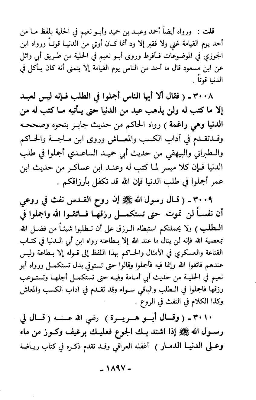 3009 - (قال رسول الله - صلّى الله عليه وسلم - إن روح القدس نفث في روعي أن نفساً لن تموت حتى تستكمل رزقها فاتقوا الله واجملوا في الطلب) ولا يحملنكم استبطاء الرزق على أن تطلبوا شيئاً من فضل الله بمعصية الله فإنه لن ينال ما عند الله إلا بطاعته رواه ابن أبي الدنيا في كتاب القناعة والعسكري في الأمثال والحاكم بهذا اللفظ إلى قوله إلا بطاعة وليس عندهم فاتقوا الله وإنما فيه فأجملوا وقالوا حتى تستوفي بدل تستكمل ورواه أبو نعيم في الحلية من حديث أبي أمامة وفيه حتى تستكمل أجلها وتستوعب رزقها فأجملوا في الطلب والباقي سواء وقد تقدم في آداب الكسب والمعاش وكذا الكلام في النفث في الروع.