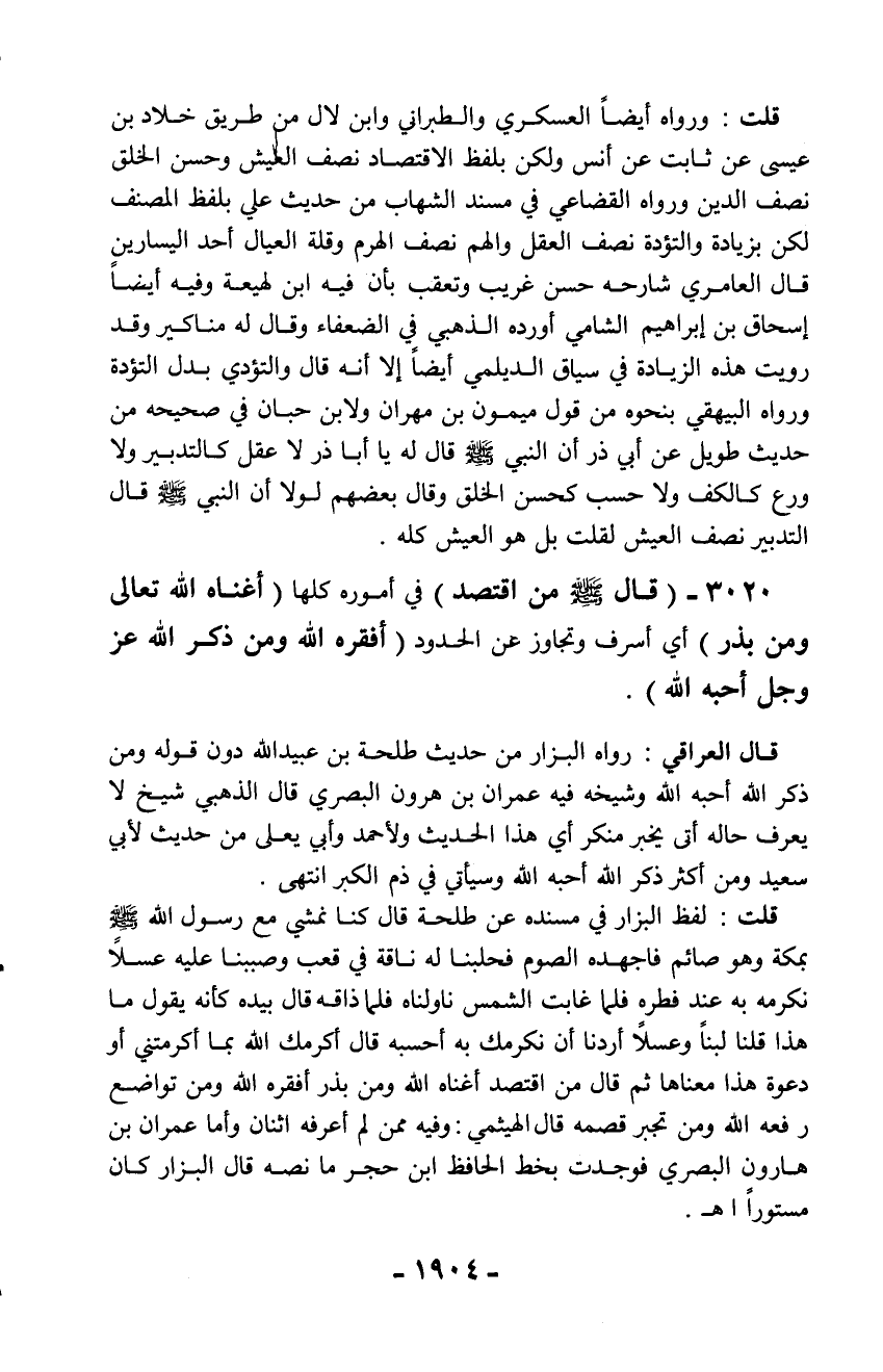 قلت: لفظ البزار في مسنده عن طلحة قال كنا نمشي مع رسول الله - صلّى الله عليه وسلم - بمكة وهو صائم فأجهده الصوم فحلبنا له ناقة في قعب وصببنا عليه عسلاً نكرمه به عند فطره فلما غابت الشمس ناولناه فلما ذاقه قال بيده كأنه يقول ما هذا قلنا لبناً وعسلاً أردنا أن نكرمك به أحسبه قال أكرمك الله بما أكرمتني أو دعوة هذا معناها ثم قال من اقتصد أغناه الله ومن بذر أفقره الله ومن تواضع رفعه الله ومن تجبر قصمه قال الهيثمي: وفيه ممن لم أعرفه اثنان وأما عمران بن هارون البصري فوجدت بخط الحافظ ابن حجر ما نصه قال البزار كان مستوراً اهـ.