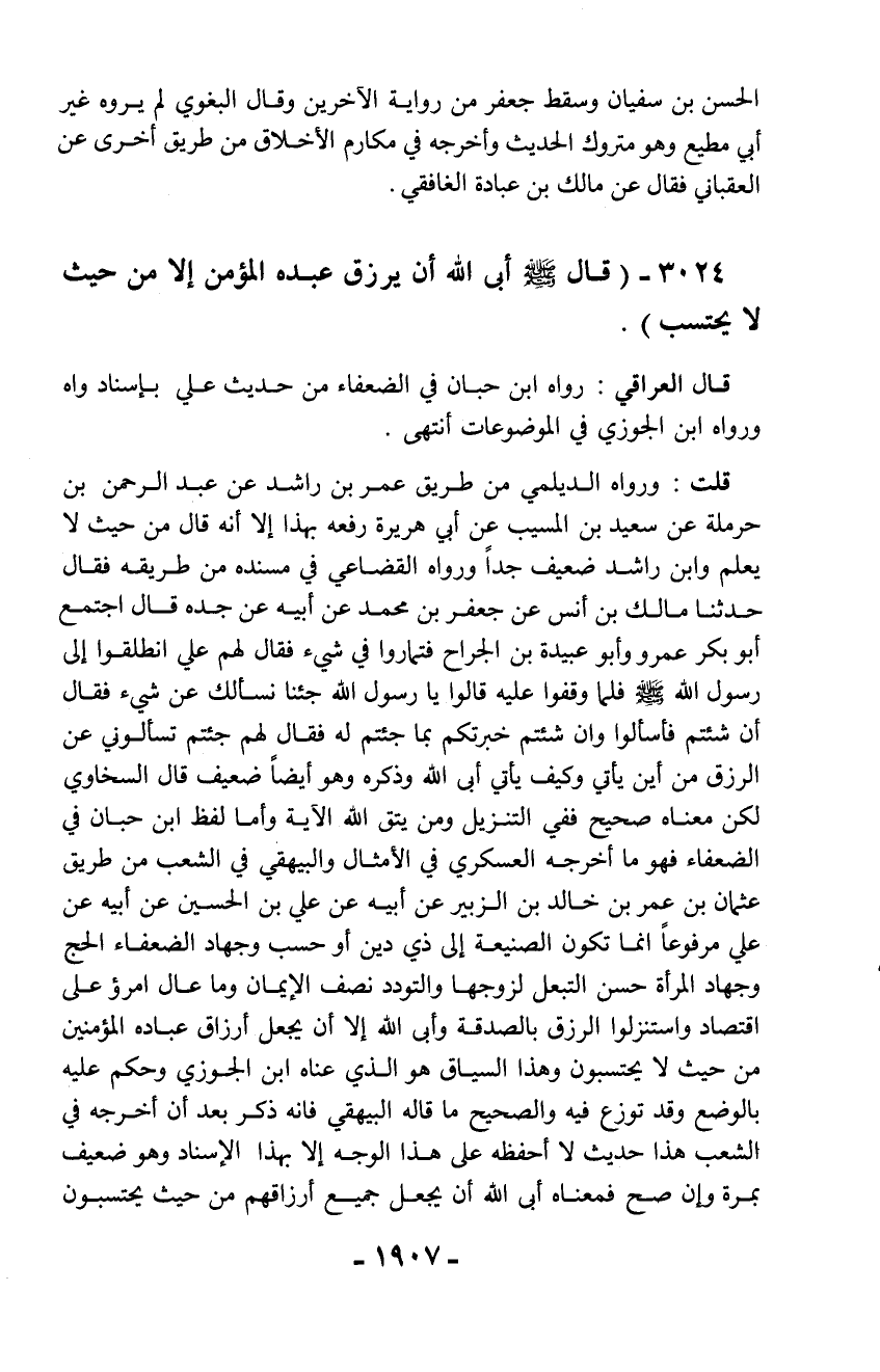 قلت: ورواه الديلمي من طريق عمر بن راشد عن عبد الرحمن بن حرملة عن سعيد بن المسيب عن أبي هريرة رفعه بهذا إلا أنه قال من حيث لا يعلم وابن راشد ضعيف جداً ورواه القضاعي في مسنده من طريقه فقال حدثنا مالك بن أنس عن جعفر بن محمد عن أبيه عن جده قال اجتمع أبو بكر عمرو وأبو عبيدة بن الجراح فتماروا في شيء فقال لهم علي انطلقوا إلى رسول الله - صلّى الله عليه وسلم - فلما وقفوا عليه قالوا يا رسول الله جئنا نسألك عن شيء فقال أن شئتم فأسألوا وإن شئتم خبرتكم بما جئتم له فقال لهم جئتم تسألوني عن الرزق من أين يأتي وكيف يأتي أبى الله وذكره وهو أيضاً ضعيف قال السخاوي لكن معناه صحيح ففي التنزيل ومن يتق الله الآية وأما لفظ ابن حبان في الضعفاء فهو ما أخرجه العسكري في الأمثال والبيهقي في الشعب من طريق عثمان بن عمر بن خالد بن الزبير عن أبيه عن علي بن الحسين عن أبيه عن علي مرفوعاً إنما تكون الصنيعة إلى ذي دين أو حسب وجهاد الضعفاء الحج وجهاد المرأة حسن التبعل لزوجها والتودد نصف الإيمان وما عال امرؤ على اقتصاد واستنزلوا الرزق بالصدقة وأبى الله إلا أن يجعل أرزاق عباده المؤمنين من حيث لا يحتسبون وهذا السياق هو الذي عناه ابن الجوزي وحكم عليه بالوضع وقد توزع فيه والصحيح ما قاله البيهقي فإنه ذكر بعد أن أخرجه في الشعب هذا حديث لا أحفظه على هذا الوجه إلا بهذا الإسناد وهو ضعيف بمرة وإن صح فمعناه أبى الله أن يجعل جميع أرزاقهم من حيث يحتسبون