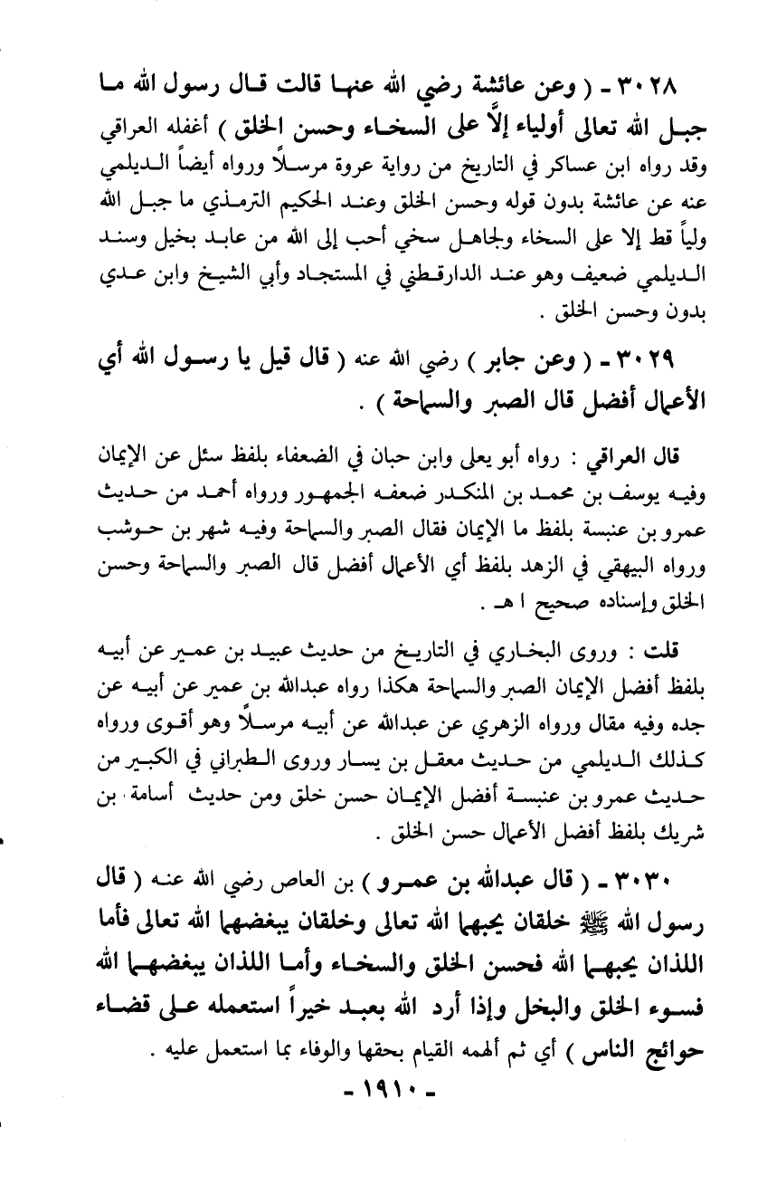 3028 - (وعن عائشة رضي الله عنها قالت قال رسول الله ما جبل الله تعالى أولياء إلاَّ على السخاء وحسن الخلق) أغفله العراقي وقد رواه ابن عساكر في التاريخ من رواية عروة مرسلاً ورواه أيضاً الديلمي عنه عن عائشة بدون قوله وحسن الخلق وعند الحكيم الترمذي ما جبل الله ولياً قط إلا على السخاء ولجاهل سخي أحب إلى الله من عابد بخيل وسند الديلمي ضعيف وهو عند الدارقطني في المستجاد وأبي الشيخ وابن عدي بدون وحسن الخلق.