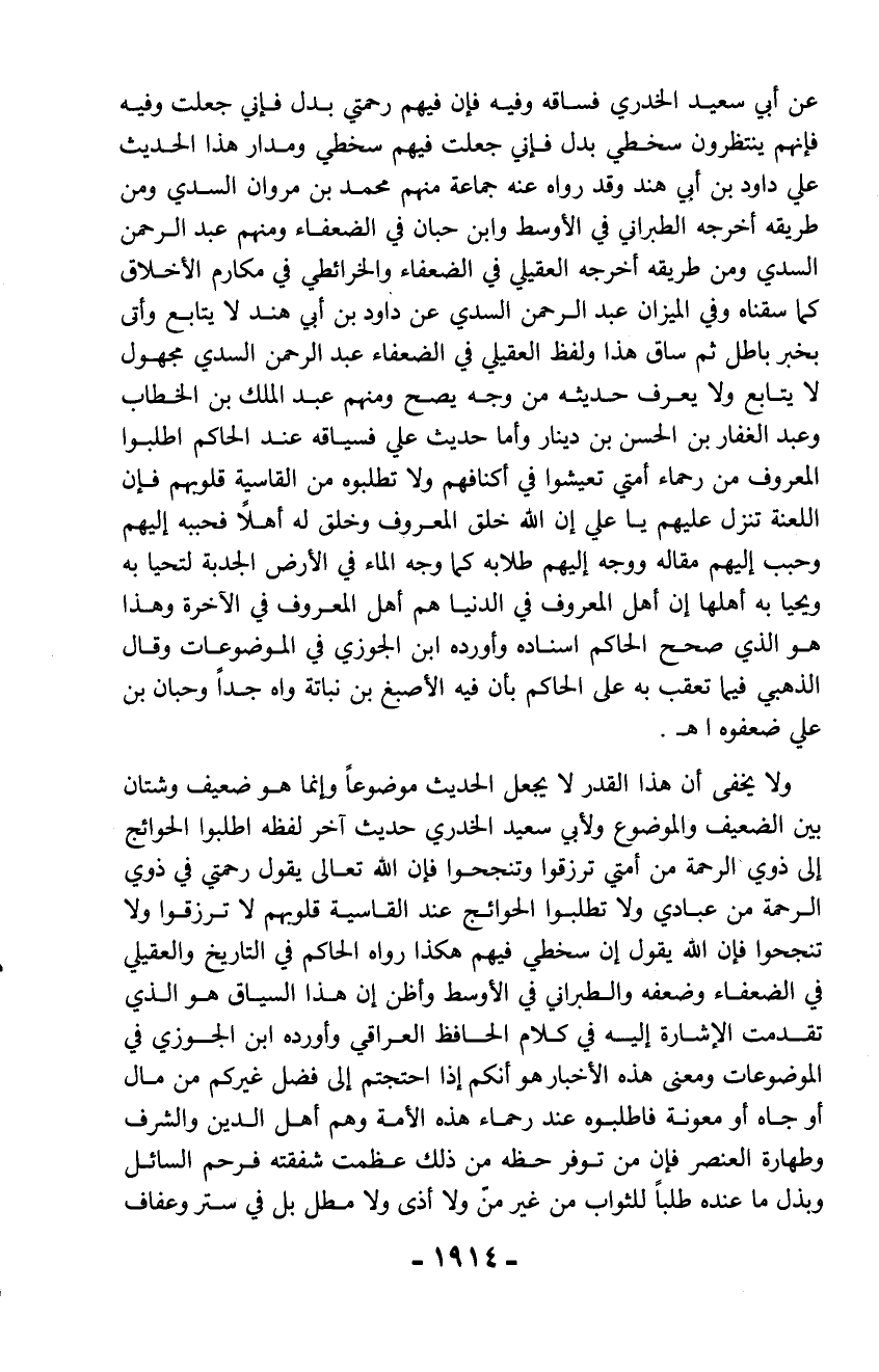 ولا يخفى أن هذا القدر لا يجعل الحديث موضوعاً وإنما هو ضعيف وشتان بين الضعيف والموضوع ولأبي سعيد الخدري حديث آخر لفظه اطلبوا الحوائج إلى ذوي الرحمة من أمتي ترزقوا وتنجحوا فإن الله تعالى يقول رحمتي في ذوي الرحمة من عبادي ولا تطلبوا الحوائج عند القاسية قلوبهم لا ترزقوا ولا تنجحوا فإن الله يقول إن سخطي فيهم هكذا رواه الحاكم في التاريخ والعقيلي في الضعفاء وضعفه والطبراني في الأوسط وأظن إن هذا السياق هو الذي تقدمت الإشارة إليه في كلام الحافظ العراقي وأورده ابن الجوزي في الموضوعات ومعنى هذه الأخبار هو أنكم إذا احتجتم إلى فضل غيركم من مال أو جاه أو معونة فاطلبوه عند رحماء هذه الأمة وهم أهل الدين والشرف وطهارة العنصر فإن من توفر حظه من ذلك عظمت شفقته فرحم السائل وبذل ما عنده طلباً للثواب من غير منّ ولا أذى ولا مطل بل في ستر وعفاف