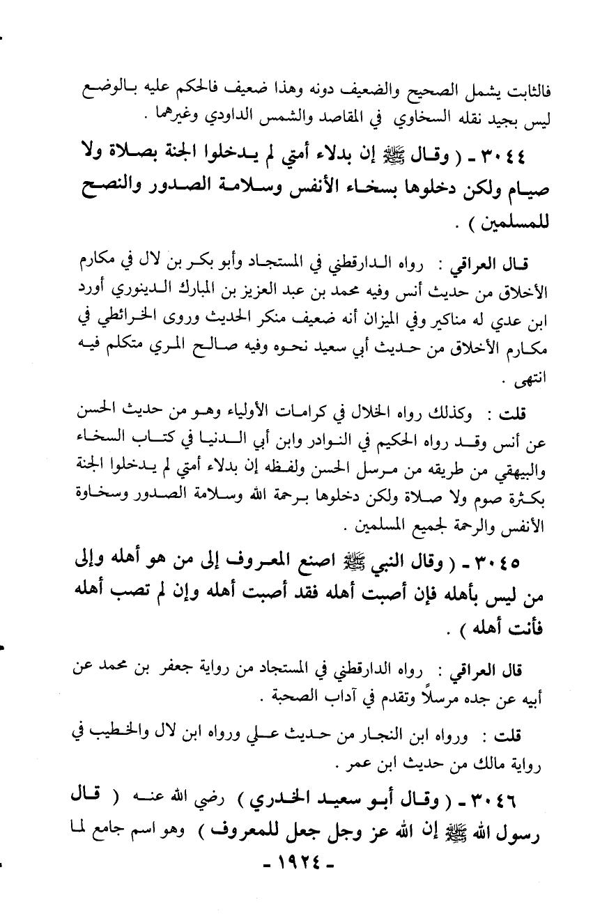3044 - (وقال - صلّى الله عليه وسلم - إن بدلاء أمتي لم يدخلوا الجنة بصلاة ولا صيام ولكن دخلوها بسخاء الأنفس وسلامة الصدور والنصح للمسلمين).