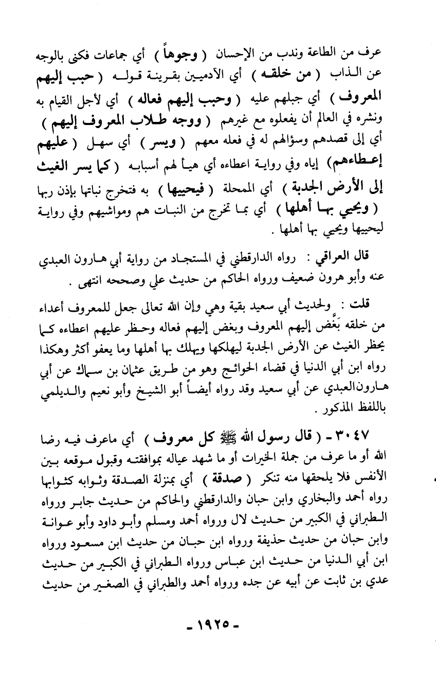 قلت: ولحديث أبي سعيد بقية وهي وإن الله تعالى جعل للمعروف أعداء من خلقه بَغَّض إليهم المعروف وبغض إليهم فعاله وحظر عليهم إعطاءه كما يحظر الغيث عن الأرض الجدبة ليهلكها ويهلك بها أهلها وما يعفو أكثر وهكذا رواه ابن أبي الدنيا في قضاء الحوائج وهو من طريق عثمان بن سماك عن أبي هارون العبدي عن أبي سعيد وقد رواه أيضاً أبو الشيخ وأبو نعيم والديلمي باللفظ المذكور.