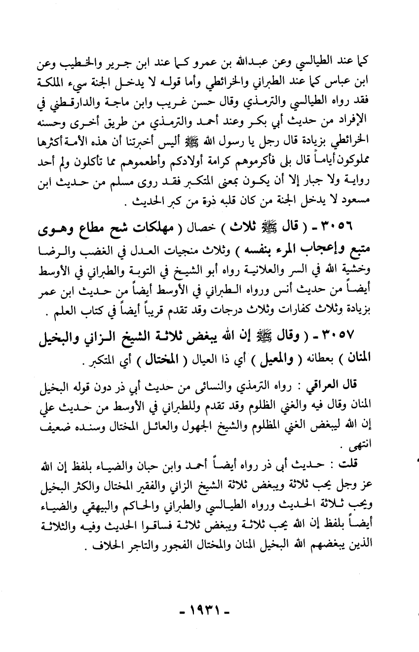 3057 - (وقال - صلّى الله عليه وسلم - إن الله يبغض ثلاثة الشيخ الزاني والبخيل المنان) بعطانه (والمعيل) أي ذا العيال (المختال) أي المتكبر.