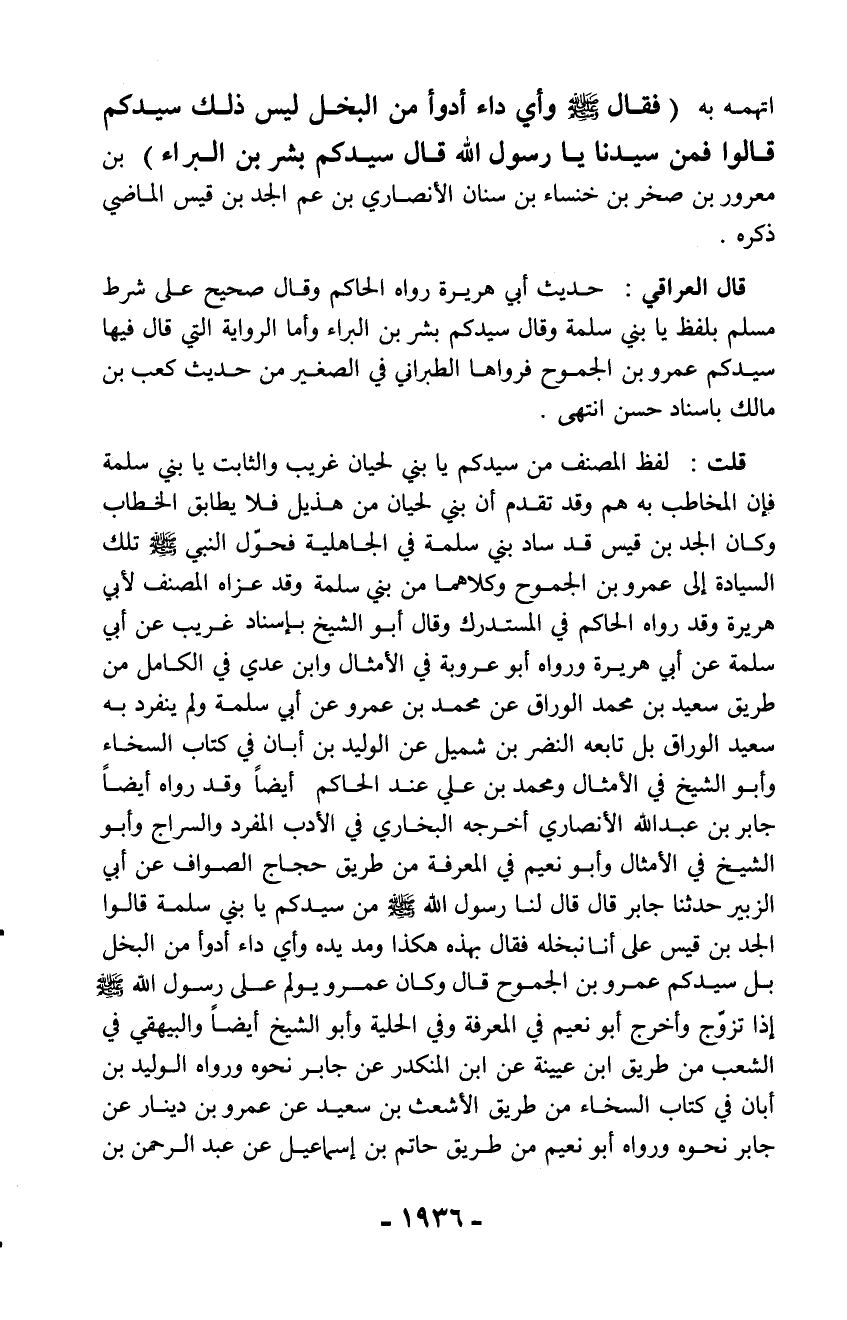 قال العراقي: حديث أبي هريرة رواه الحاكم وقال صحيح على شرط مسلم بلفظ يا بني سلمة وقال سيدكم بشر بن البراء وأما الرواية التي قال فيها سيدكم عمرو بن الجموح فرواها الطبراني في الصغير من حديث كعب بن مالك بإسناد حسن انتهى.