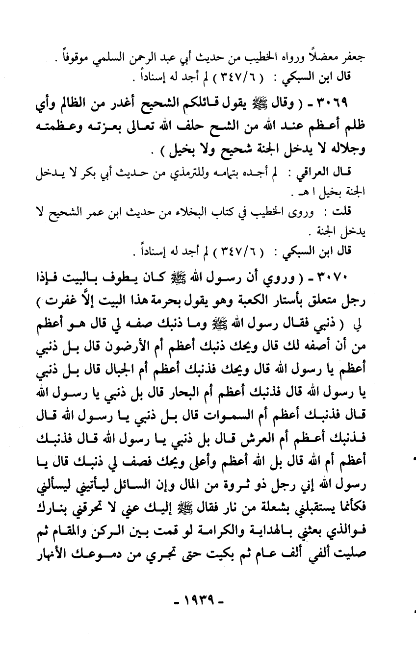 3069 - (وقال - صلّى الله عليه وسلم - يقول قائلكم الشحيح أغدر من الظالم وأي ظلم أعظم عند الله من الشح حلف الله تعالى بعزته وعظمته وجلاله لا يدخل الجنة شحيح ولا بخيل).