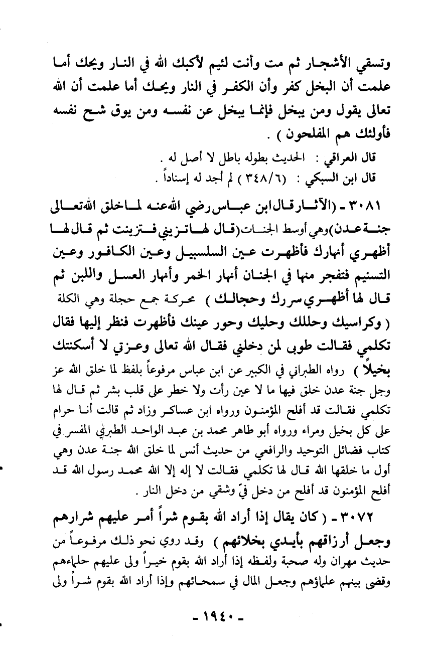 3081 - (الآثار قال ابن عباس رضي الله عنه لما خلق الله تعالى جنة عدن) وهي أوسط الجنات (قال لها تزيني فتزينت ثم قال لها أظهري أنهارك فأظهرت عين السلسبيل وعين الكافور وعين التسنيم فتفجر منها في الجنان أنهار الخمر وأنهار العسل واللبن ثم قال لها أظهري سررك وحجالك) محركة جمع حجلة وهي الكلة (وكراسيك وحللك وحليك وحور عينك فأظهرت فنظر إليها فقال تكلمي فقالت طوبى لمن دخلني فقال الله تعالى وعزتي لا أسكنتك بخيلاً) رواه الطبراني في الكبير عن ابن عباس مرفوعاً بلفظ لما خلق الله عز وجل جنة عدن خلق فيها ما لا عين رأت ولا خطر على قلب بشر ثم قال لها تكلمي فقالت قد أفلح المؤمنون ورواه ابن عساكر وزاد ثم قالت أنا حرام على كل بخيل ومراء ورواه أبو طاهر محمد بن عبد الواحد الطبري المفسر في كتاب فضائل التوحيد والرافعي من حديث أنس لما خلق الله جنة عدن وهي أول ما خلقها الله قال لها تكلمي فقالت لا إله إلا الله محمد رسول الله قد أفلح المؤمنون قد أفلح من دخل فيّ وشقي من دخل النار.