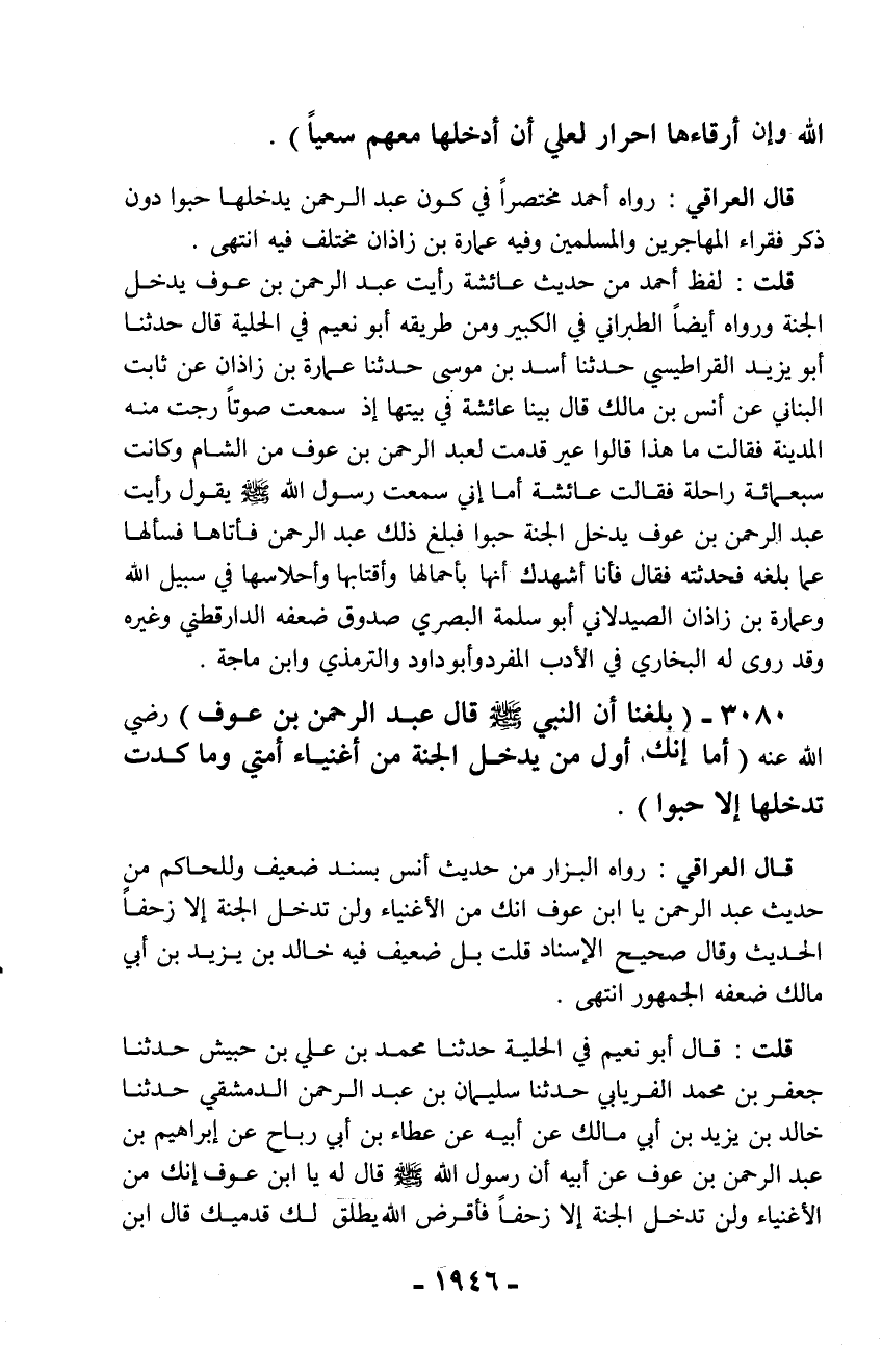 3080 - (بلغنا أن النبي - صلّى الله عليه وسلم - قال عبد الرحمن بن عوف) رضي الله عنه (أما إنك أول من يدخل الجنة من أغنياء أمتي وما كدت تدخلها إلا حبوا).