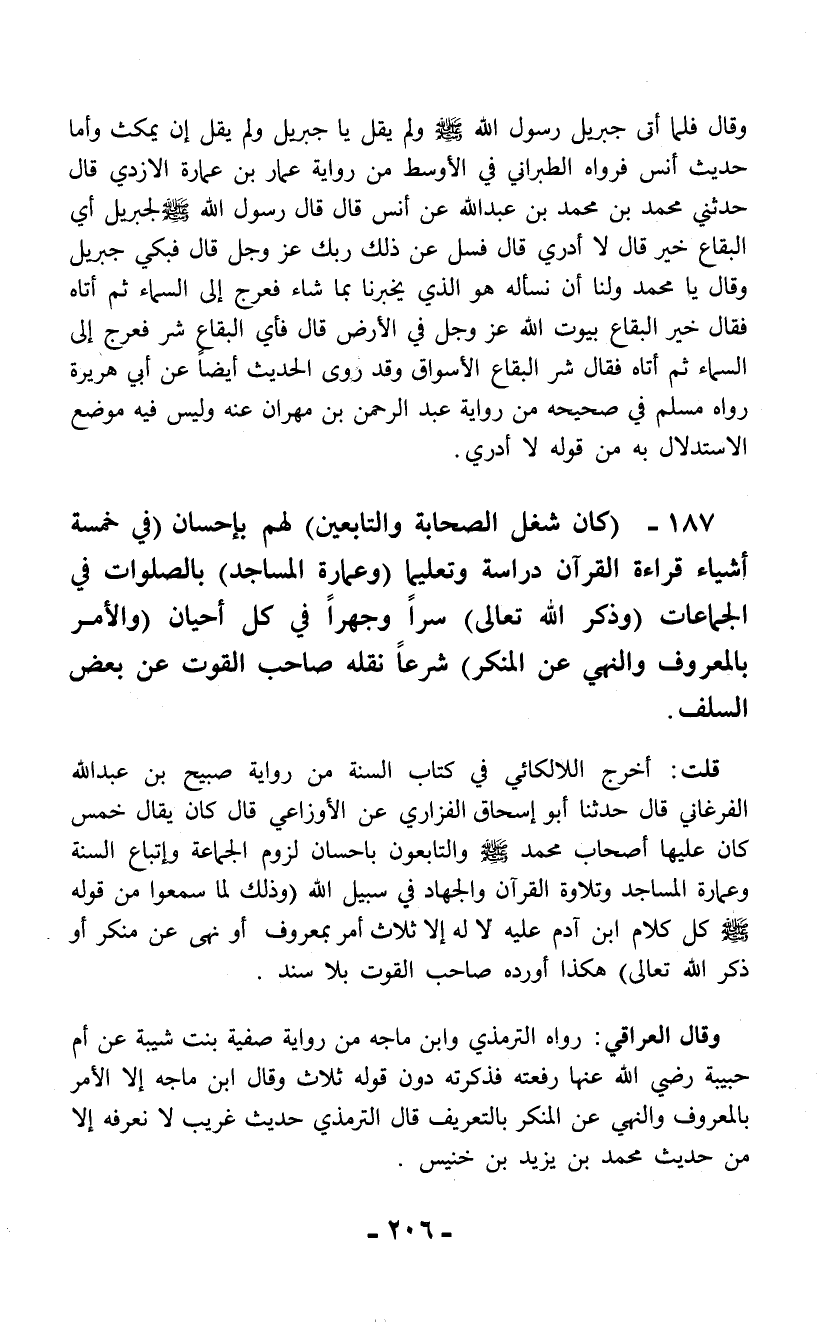 قلت: أخرج اللالكائي في كتاب السنة من رواية صبيح بن عبد الله الفرغاني قال حدثنا أبو إسحاق الفزاري عن الأوزاعي قال كان يقال خمس كان عليها أصحاب محمد - صلى الله عليه وسلم - والتابعون بإحسان لزوم الجماعة وإتباع السنة وعمارة المساجد وتلاوة القرآن والجهاد فى سبيل الله (وذلك لما سمعوا من قوله - صلى الله عليه وسلم - كل كلام ابن آدم عليه لا له إلا ثلاث أمر بمعروف أو نهى عن منكر أو ذكر الله تعالى) هكذا أورده صاحب القوت بلا سند.