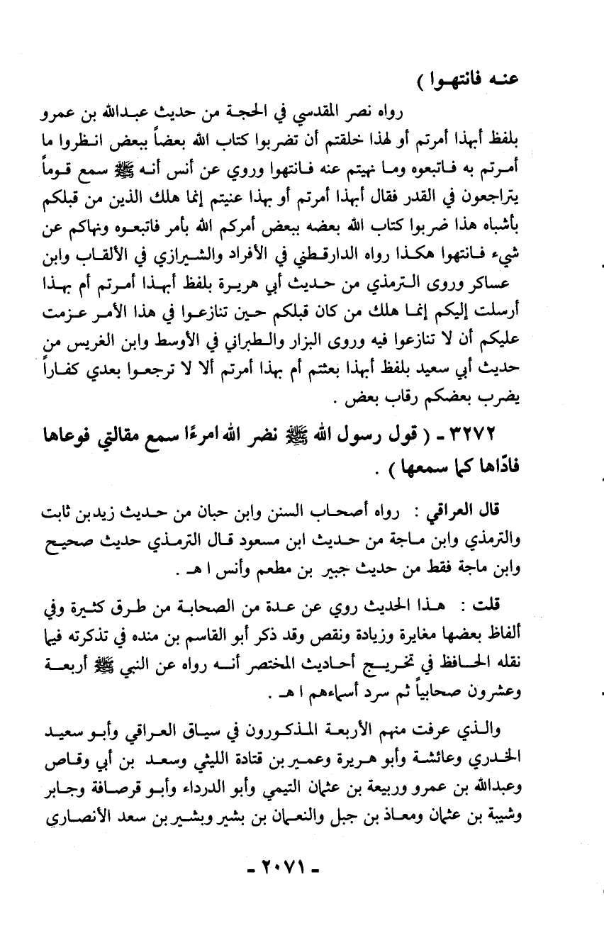 3272 - (قول رسول الله - صلّى الله عليه وسلم - نضر الله امرءًا سمع مقالتي فوعاها فادّاها كما سمعها).