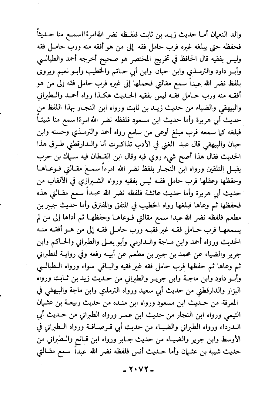 والد النعمان أما حديث زيد بن ثابت فلفظه نضر الله امرءًا سمع منا حديثاً فحفظه حتى يبلغه غيره فرب حامل فقه إلى من هو أفقه منه ورب حامل فقه وليس بفقيه قال الحافظ في تخريج المختصر هو صحيح أخرجه أحمد والطيالسي وأبو داود والترمذي وابن حبان وابن أبي حاتم والخطيب وأبو نعيم ويروى بلفظ نضر الله عبداً سمع مقالتي فحملها إلى غيره فرب حامل فقه إلى من هو أفقه منه ورب حامل فقه ليس بفقيه الحديث هكذا رواه أحمد والطبراني والبيهقي والضياء من حديث زيد بن ثابت ورواه ابن النجار بهذا اللفظ من حديث أبي هريرة وأما حديث ابن مسعود فلفظه نضر الله امرءًا سمع منا شيئاً فبلغه كما سمعه فرب مبلغ أوعى من سامع رواه أحمد والترمذي وحسنه وابن حبان والبيهقي قال عبد الغني في الأدب تذاكرت أنا والدارقطني طرق هذا الحديث فقال هذا أصح شيء روي فيه وقال ابن القطان فيه سماك بن حرب يقبل التلقين ورواه ابن النجار بلفظ نضر الله امرءاً سمع مقالتي فوعاها وحفظها وعقلها فرب حامل فقه ليس بفقيه ورواه الشيرازي في الألقاب من حديث أبي هريرة وأما حديث عائشة فلفظه نضر الله عبداً سمع مقالتي هذه فحفظها ثم وعاها فبلغها رواه الخطيب في المتفق والمفترق وأما حديث جبير بن مطعم فلفظه نضر الله عبدا سمع مقالتي فوعاها وحفظها ثم أداها إلى من لم يسمعها فرب حامل فقه غير فقيه ورب حامل فقه إلى من هو أفقه منه الحديث ورواه أحمد وابن ماجة والدارمي وأبو يعلى والطبراني والحاكم وابن جرير والضياء عن محمد بن جبير بن مطعم عن أبيه رفعه وفي رواية للطبراني ثم وعاها ثم حفظها فرب حامل فقه غير فقيه والباقي سواء ورواه الطيالسي وأبو داود وابن ماجة وابن جرير والطبراني من حديث زيد بن ثابت ورواه البزار والدارقطني من حديث أبي سعيد ورواه الترمذي وابن ماجة والبيهقي في المعرفة من حديث ابن مسعود ورواه ابن منده من حديث ربيعة بن عثمان التيمي ورواه ابن النجار من حديث ابن عمر ورواه الطبراني من حديث أبي الدرداء ورواه الطبراني والضياء من حديث أبي قرصافة ورواه الطبراني في الأوسط وابن جرير والضياء من حديث جابر ورواه ابن قانع والطبراني من حديث شيبة بن عثمان وأما حديث أنس فلفظه نضر الله عبداً سمع مقالتي