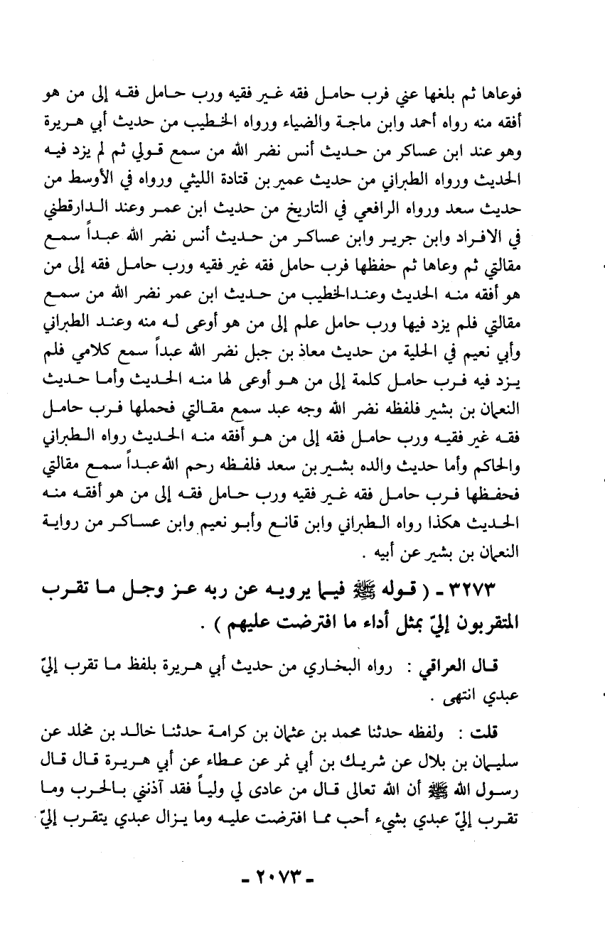 3273 - (قوله - صلّى الله عليه وسلم - فيما يرويه عن ربه عز وجل ما تقرب المتقربون إليّ بمثل أداء ما افترضت عليهم).