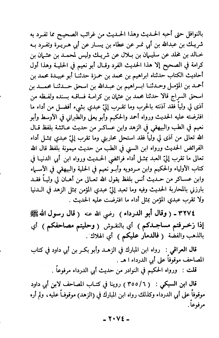 بالنوافل حتى أحبه الحديث وهذا الحديث من غرائب الصحيح مما تفرد به شريك بن عبد الله بن أبي نمر عن عطاء بن يسار عن أبي هريرة وتفرد به خالد بن مخلد عن سليمان بن بلال عن شريك وليس لمحمد بن عثمان بن كرامة في الصحيح إلا هذا الحديث الفرد وقال أبو نعيم في الحلية وهذا أول أحاديث الكتاب حدثناه إبراهيم بن محمد بن حمزة حدثنا أبو عبيدة محمد بن أحمد بن المؤمل وحدثنا إبراهيم بن عبد الله بن إسحاق حدثنا محمد بن إسحاق السراج قالا حدثنا محمد بن عثمان بن كرامة فساقه بسنده ولفظه من آذى لي ولياً فقد آذنته بالحرب وما تقرب إليّ عبدي بشيء أفضل من أداء ما افترضته عليه الحديث ورواه أحمد والحكيم وأبو يعلى والطبراني في الأوسط وأبو نعيم في الطب والبيهقي في الزهد وابن عساكر من حديث عائشة بلفظ قال الله تعالى من آذى لي ولياً فقد استحل محاربتي وما تقرب إليّ عبدي بمثل أداء الفرائض الحديث ورواه ابن السني في الطب من حديث ميمونة بلفظ قال الله تعالى ما تقرب إليّ العبد بمثل أداء فرائضي الحديث ورواه ابن أبي الدنيا في كتاب الأولياء والحكيم وابن مردويه وأبو نعيم في الحلية والبيهقي في الأسماء وابن عساكر من حديث أنس بلفظ يقول الله تعالى من أهان لى ولياً فقد بارزني بالمحاربة الحديث وفيه وما تعبد إليّ عبدي المؤمن بمثل الزهد في الدنيا ولا تقرب عبدي المؤمن بمثل أداء ما افترضت عليه الحديث.