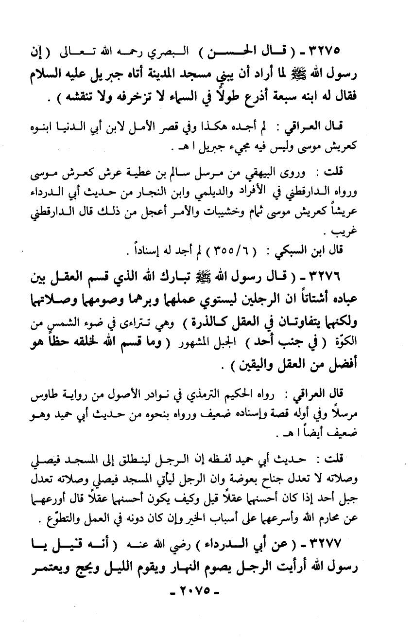 3275 - (قال الحسن) البصري رحمه الله تعالى (إن رسول الله - صلّى الله عليه وسلم - لما أراد أن يبني مسجد المدينة أتاه جبريل عليه السلام فقال له ابنه سبعة أذرع طولاً في السماء لا تزخرفه ولا تنقشه).