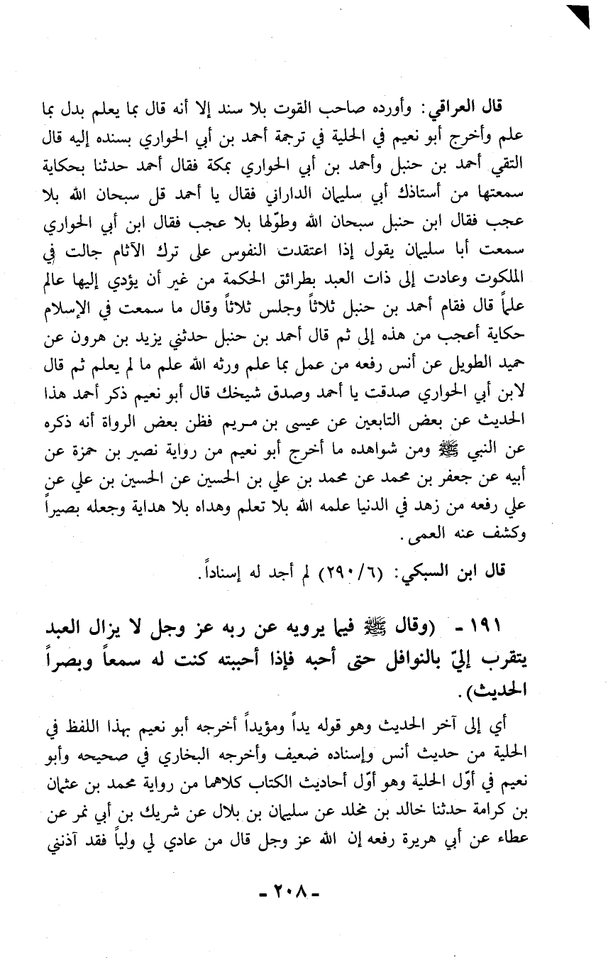 191 - (وقال - صلى الله عليه وسلم - فيما يرويه عن ربه عز وجل لا يزال العبد يتقرب إليّ بالنوافل حتى أحبه فإذا أحببته كنت له سمعاً وبصراً الحديث).