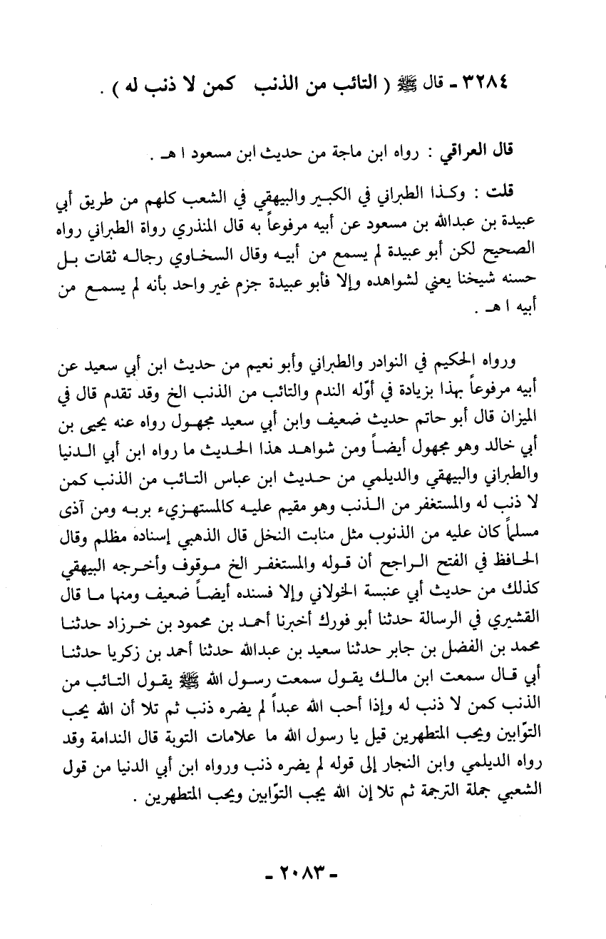 3284 - قال - صلّى الله عليه وسلم - (التائب من الذنب كمن لا ذنب له).