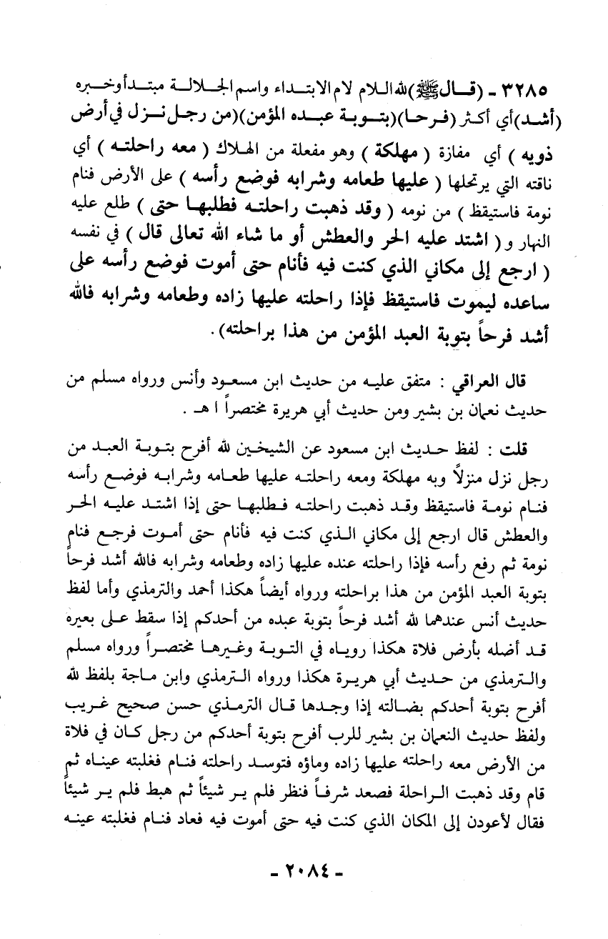 3285 - (قال - صلّى الله عليه وسلم -) لله اللام لام الابتداء واسم الجلالة مبتدأ وخبره (أشد) أي أكثر (فرحا) (بتوبة عبده المؤمن) (من رجل نزل في أرض ذويه) أي مفازة (مهلكة) وهو مفعلة من الهلاك (معه راحلته) أي ناقته التي يرتحلها (عليها طعامه وشرابه فوضع رأسه) على الأرض فنام نومة فاستيقظ) من نومه (وقد ذهبت راحلته فطلبها حتى) طلع عليه النهار و (اشتد عليه الحر والعطش أو ما شاء الله تعالى قال) في نفسه (ارجع إلى مكاني الذي كنت فيه فأنام حتى أموت فوضع رأسه على ساعده ليموت فاستيقظ فإذا راحلته عليها زاده وطعامه وشرابه فالله أشد فرحاً بتوبة العبد المؤمن من هذا براحلته).
