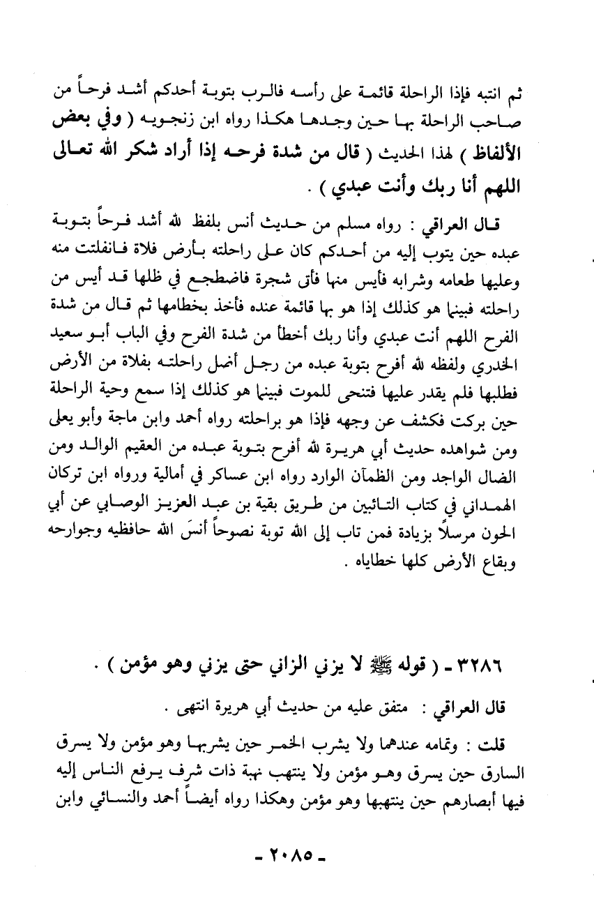 قال العراقي: رواه مسلم من حديث أنس بلفظ لله أشد فرحاً بتوبة عبده حين يتوب إليه من أحدكم كان على راحلته بأرض فلاة فانفلتت منه وعليها طعامه وشرابه فأيس منها فأتى شجرة فاضطجع في ظلها قد أيس من راحلته فبينما هو كذلك إذا هو بها قائمة عنده فأخذ بخطامها ثم قال من شدة الفرح اللهم أنت عبدي وأنا ربك أخطأ من شدة الفرح وفي الباب أبو سعيد الخدري ولفظه لله أفرح بتوبة عبده من رجل أضل راحلته بفلاة من الأرض فطلبها فلم يقدر عليها فتنحى للموت فبينما هو كذلك إذا سمع وحية الراحلة حين بركت فكشف عن وجهه فإذا هو براحلته رواه أحمد وابن ماجة وأبو يعلى ومن شواهده حديث أبي هريرة لله أفرح بتوبة عبده من العقيم الوالد ومن الضال الواجد ومن الظمآن الوارد رواه ابن عساكر في أماليه ورواه ابن تركان الهمداني في كتاب التائبين من طريق بقية بن عبد العزيز الوصابي عن أبي الحون مرسلاً بزيادة فمن تاب إلى الله توبة نصوحاً أنس الله حافظيه وجوارحه وبقاع الأرض كلها خطاياه.